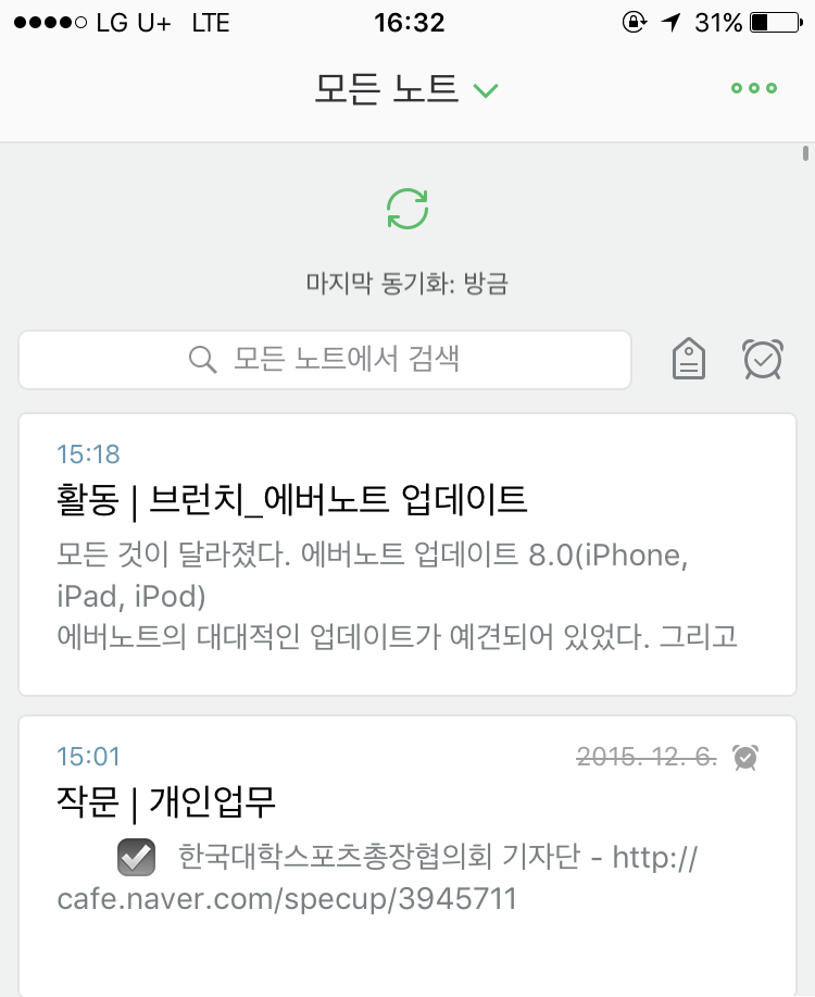 1) 기존의 에버노트에서 동기화를 할려면 왼쪽에서 오른쪽으로 스와이핑한 뒤 동기화 버튼을 눌러야 가능했다. 업데이트 된 에버노트에서는 노트 목록에서 위에서 아래로 한번만 스와이핑하면 동기화가 가능하다. 빠른 동기화를 위해 수동으로 자주 동기화를 누르곤 했는데 이젠 습관적으로 동기화를 할 수 있게 되어 넘나 기쁘다.