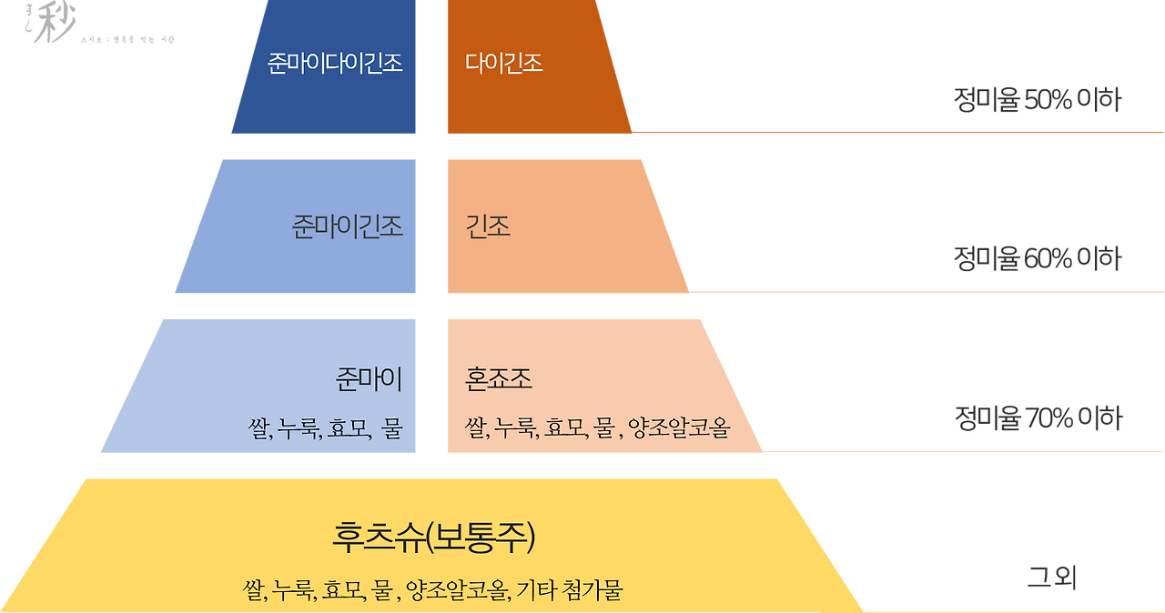 일반적으로 등급은 정미율 70%, 60%, 50%가 기준이다. 양조알코올 없이 정미율 70% 이하는 준마이, 60% 이하는 준마이긴조, 50% 이하는 준마이다이긴조라고 한다. 양조알코올을 첨가하여 정미율 70% 이하는 혼죠조, 60% 이하는 긴조, 50% 이하는 다이긴조라고 한다.