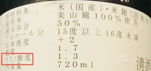 사케에 포함된 아미노산의 농도를 말한다. 일반적으로 1.3~1.7 정도이다. 일본주도, 산도와 마찬가지로 사케의 맛에 영향을 미친다. 사케의 아미노산에는 아르기닌, 티로신, 세린 등이 있다. 간단하게 아미노산도가 높을수록 농후하고 깊고 풍부한 맛이 나며 낮을수록 담백하고 은은하고, 옅은 맛이 난다. 사실 내가 쓰면서도 무슨 맛인지 와닿지 않는다. 어떤 느낌이 풍부한 느낌인지 알 수가 없거든.
