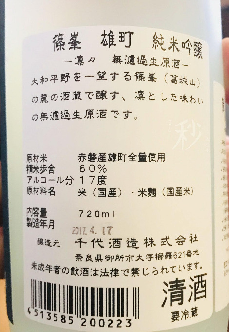 한자를 몰라서 읽지 못하는 제조사, 양조장 정도는 쿨하게 무시하고 있다가 뒷면라벨에서 찾아보자. 자신만의 사케 취향을 파악하기 위해선 양조장의 스타일을 기억하는 게 좋기 때문에 양조장의 이름도 같이 알고 있는 걸 추천한다. 고급 사케를 마실수록, 사케를 깊이 알아갈수록 무시할 수 없는 게 양조장만의 스타일이다. 그리고 제조 일자와 알코올분 등이 적혀 있다.