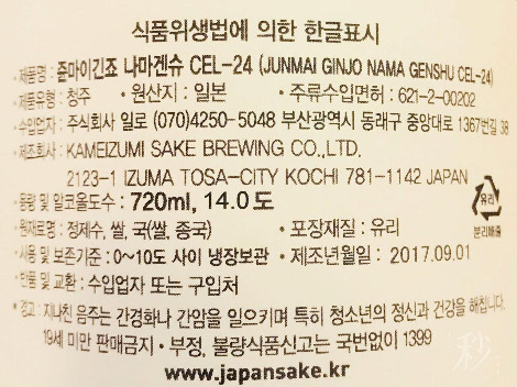 뒷면라벨에 적힌 정식 수입명칭을 읽어도 사케 전문가들이 말하는 명칭이랑 다른 경우도 있다. 내 인생 최초의 사케 ‘카메이즈미 준마이긴조 나마겐슈 CEL-24’가 그렇다. 수입명칭은 '준마이긴조 나마겐슈 CEL-24’로 적혀 있지만 사케 전문가들은 앞에 제조사인 ‘카메이즈미’를 붙여서 불렀다. 이래서 사케는 공부를 많이 해야 하는구나 싶다.