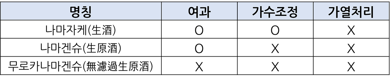 쉽게 외우는 방법은 일단 셋 다 가열처리를 안 한다. 두 번째는 가수조정. 나마자케(生酒)는 원주(原酒)가 아니다. 물을 초큼 탔다. 나마겐슈(生原酒)는 여과만 거친 것이다. 무로카나마겐슈(無濾過生原酒)는 이름이 길다. 무여과라는 단어가 앞에 붙었기 때문이다. 쉽게 외우는 방법을 알려주는 이유는? 내가 안 외워져서 혼자 연구를 해보았기 때문이다. 하하.
