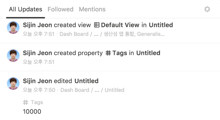 변경 내용을 모두 확인할 수 있습니다. 계정 전체, 노트 별로 확인 가능합니다.