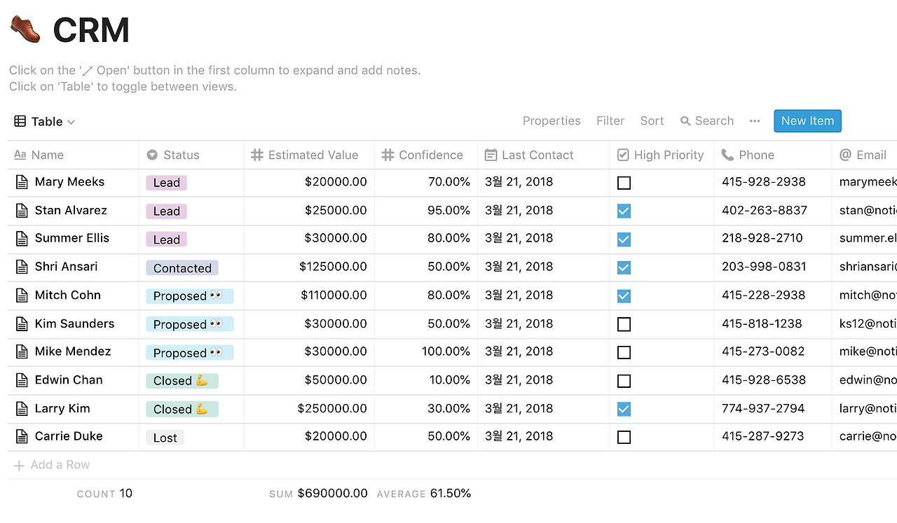 비용 지출, 고객 관리, 참가자 관리 등을 Spread sheet로 하고 계셨나요? 그렇다면 또 파일을 생성하셨겠군요. Notion을 활용하시면 그럴 필요 없습니다. 표는 기본적인 표의 기능뿐만 아니라 Spread sheet에서 활용 가능한 간단한 함수 기능을 활용할 수 있기 때문입니다. 크게 아쉬운 점은 아직 원화 표시가 안됩니다.