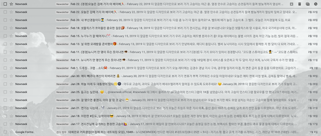 차고 넘치는 이메일 속에서 독보적으로 성장하는 회사가 있습니다. 밀레니얼을 위한 시사 뉴스레터 '뉴닉(NEW NEEK)'은 뉴스를 읽고 싶지만 어려워서, 시간이 없어서 읽지 '못'하는 밀레니얼 세대들을 위해 매주 월, 수, 금 시사 뉴스를 뉴닉만의 톤앤매너로 정리해서 보내줍니다. 스팸의 홍수 속에서도 평균 오픈율 50%를 달성하는 엄청난 회사죠. 사무직에 종사하지 않은 사람은 특히나 잘 읽지도 않는(뇌피셜) 이메일을 비즈니스 도구로 선택해 밀레니얼 세대들을 열광하게 만든 서비스입니다.