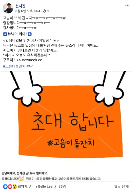1) 고슴맘은 과연 누구일까? 어떤 사람들이 이렇게 재밌는 콘텐츠를 만들어 냈을까? 하는 궁금함이었습니다. 저는 올해 2월부터 고슴이를 만났는데요. 뉴닉은 그때부터 일관적으로 밀레니얼 세대가 친근함을 느낄 수 있는 말투를 유지하고 있습니다. 어려운 정치, 경제 뉴스를 다루면서도 바로 옆에 있는 내 친구가 말해주듯이 전달하기 때문에 아주 쉽게 읽을 수 있죠. 그래서 아침마다 고슴이가 말해주는 뉴스들은 쉽게 이해할 수 있고, 덕분에 이제는 아버지와 세상 돌아가는 얘기를 하면 "오.. 너 요즘 신문 좀 읽나 보다?"라는 말을 듣고 있답니다.