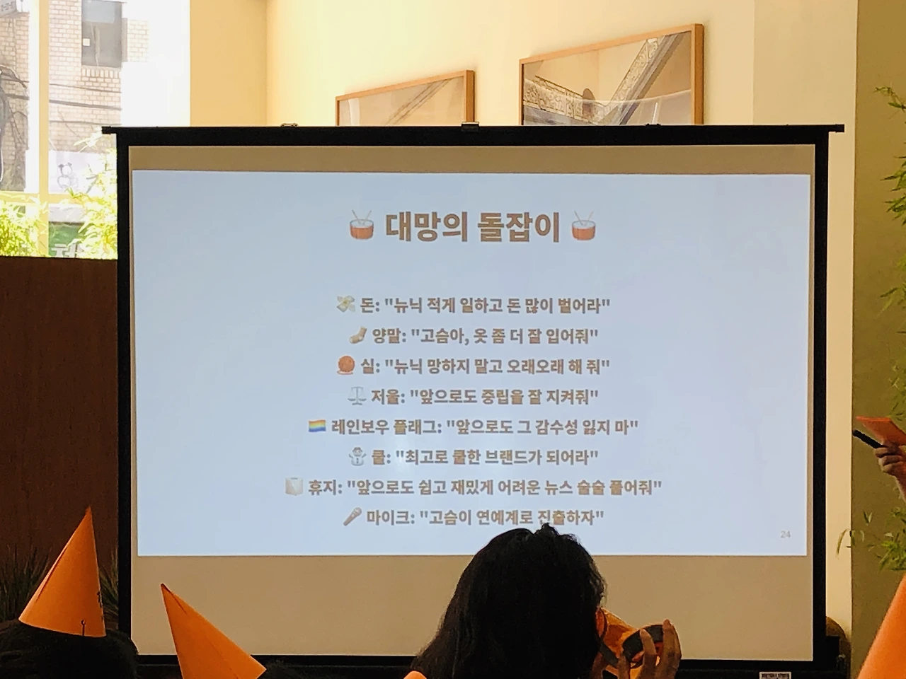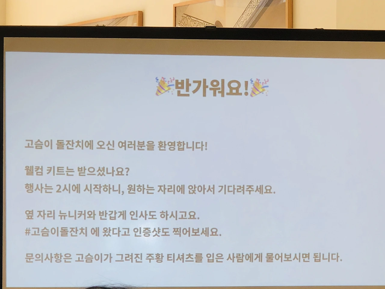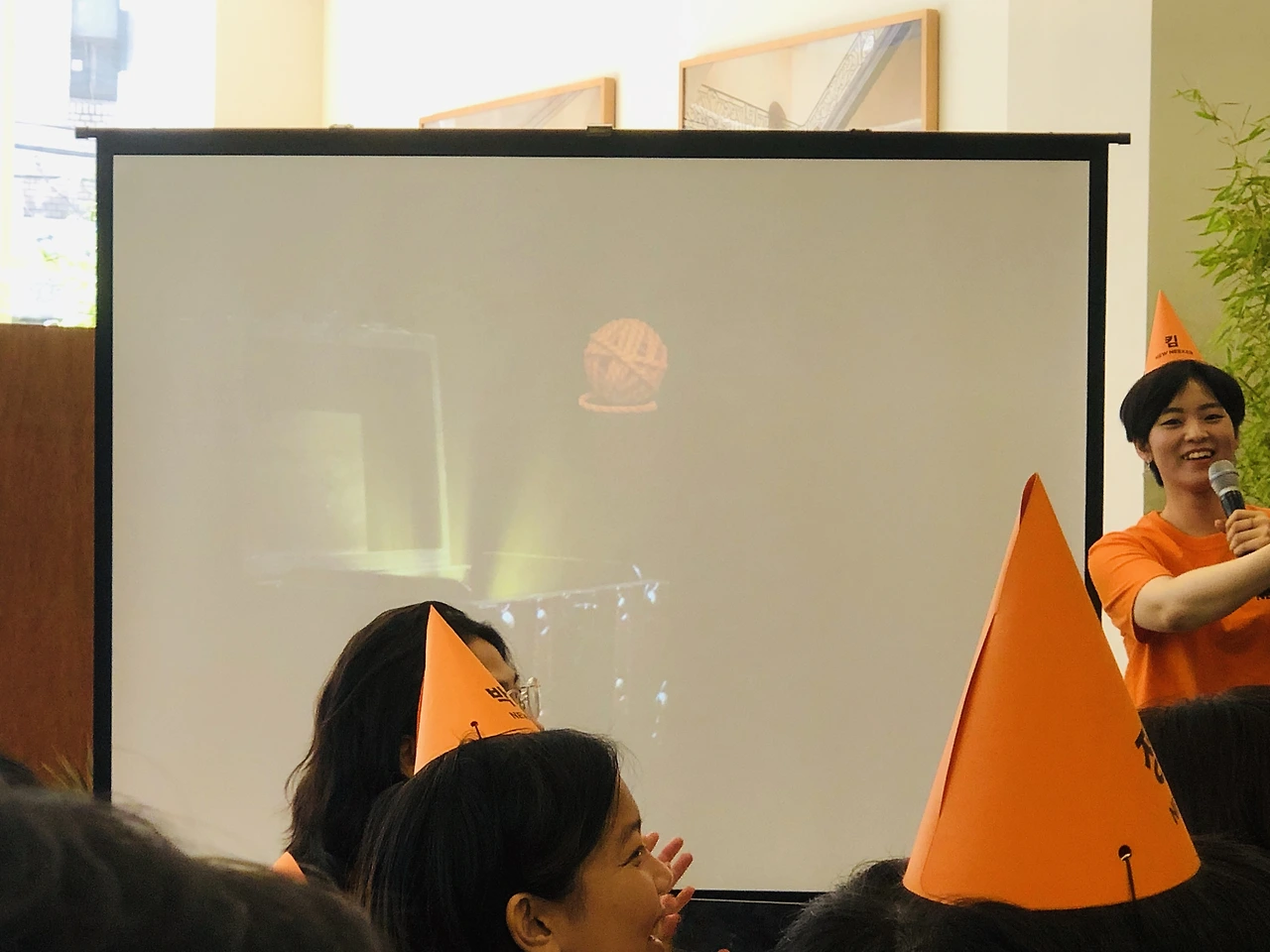 출석 체크를 하면 제 이름이 적힌 꼬깔 모자와 행사 아젠다가 적힌 종이, 그리고 떡을 나눠주는데요, 그 떡마저 너무 사랑스러워서 크흡.. 꼬깔 모자는 그냥 이름표 대신인 줄 알았어요. 행사 아젠다 상에는 옆 사람과 대화를 나누거나 네트워킹하는 시간이 없는데 왜 이름이 적혀있을까 했는데 나중에 엄청난 기능이..