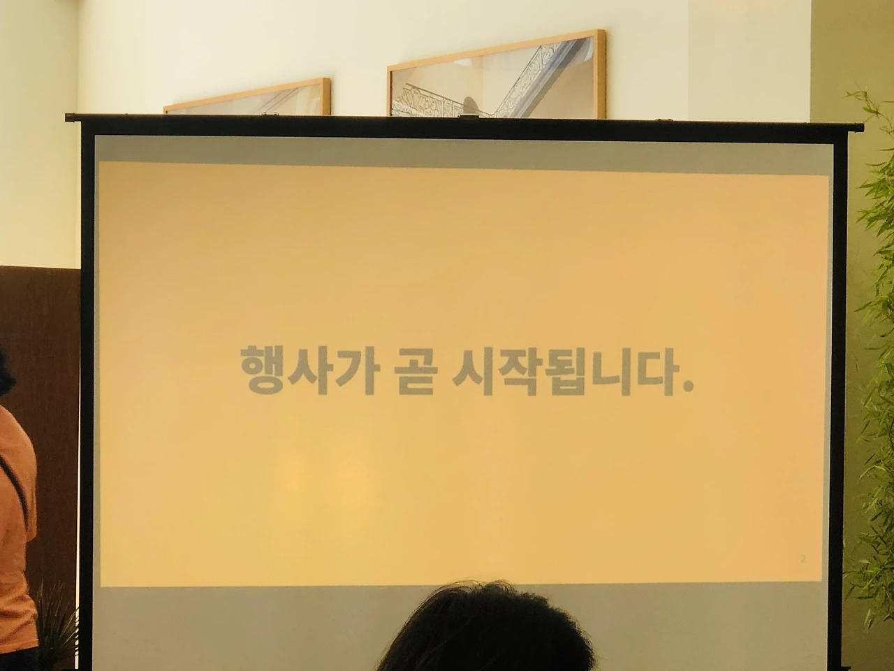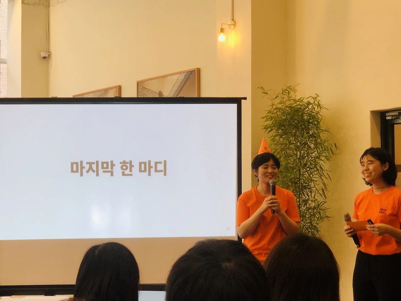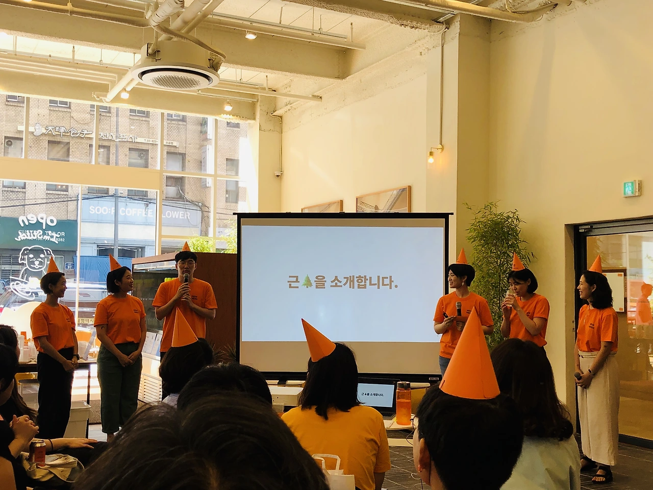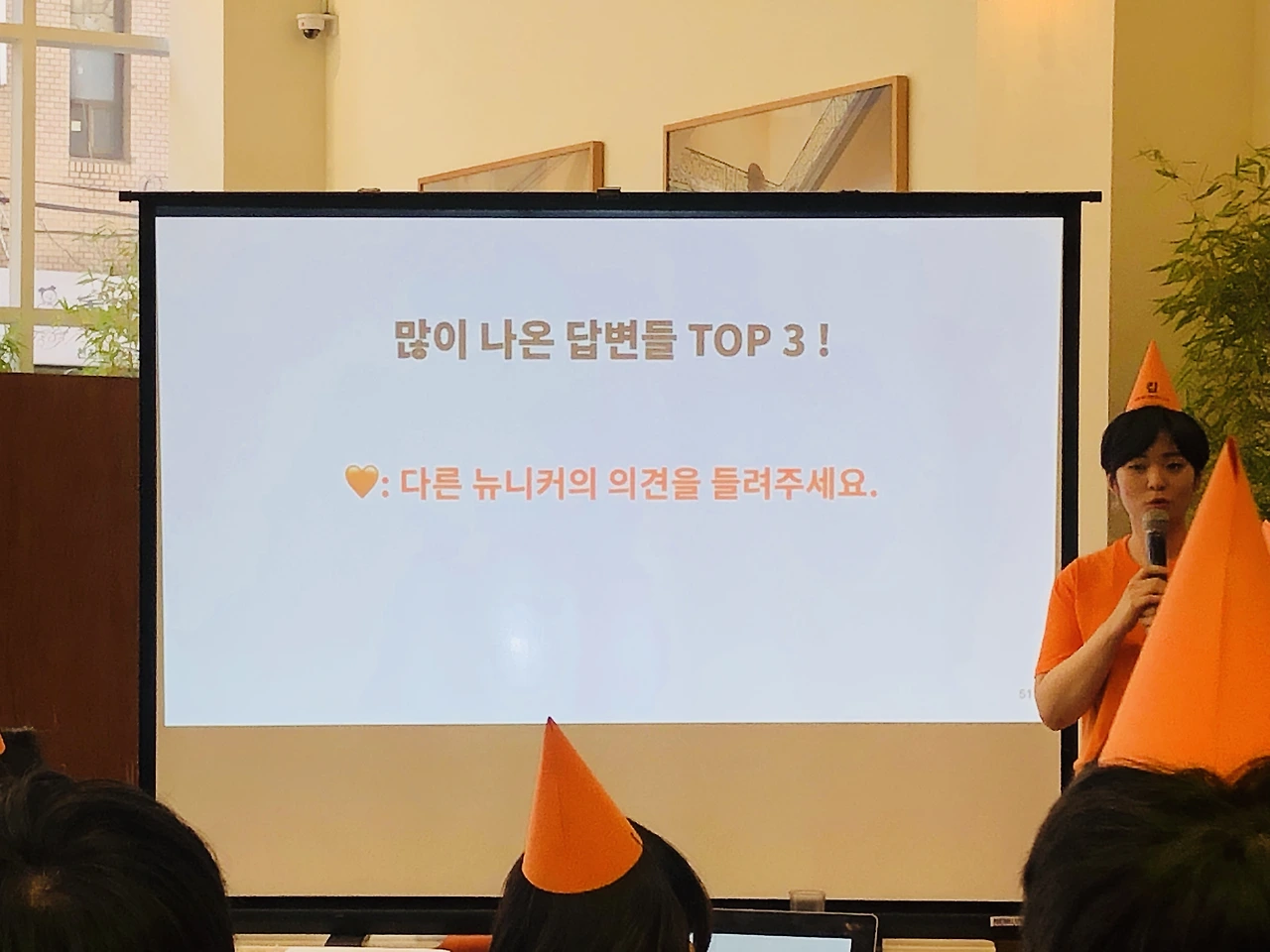 출석 체크를 하면 제 이름이 적힌 꼬깔 모자와 행사 아젠다가 적힌 종이, 그리고 떡을 나눠주는데요, 그 떡마저 너무 사랑스러워서 크흡.. 꼬깔 모자는 그냥 이름표 대신인 줄 알았어요. 행사 아젠다 상에는 옆 사람과 대화를 나누거나 네트워킹하는 시간이 없는데 왜 이름이 적혀있을까 했는데 나중에 엄청난 기능이..