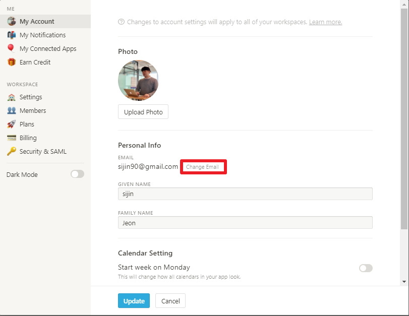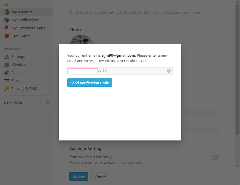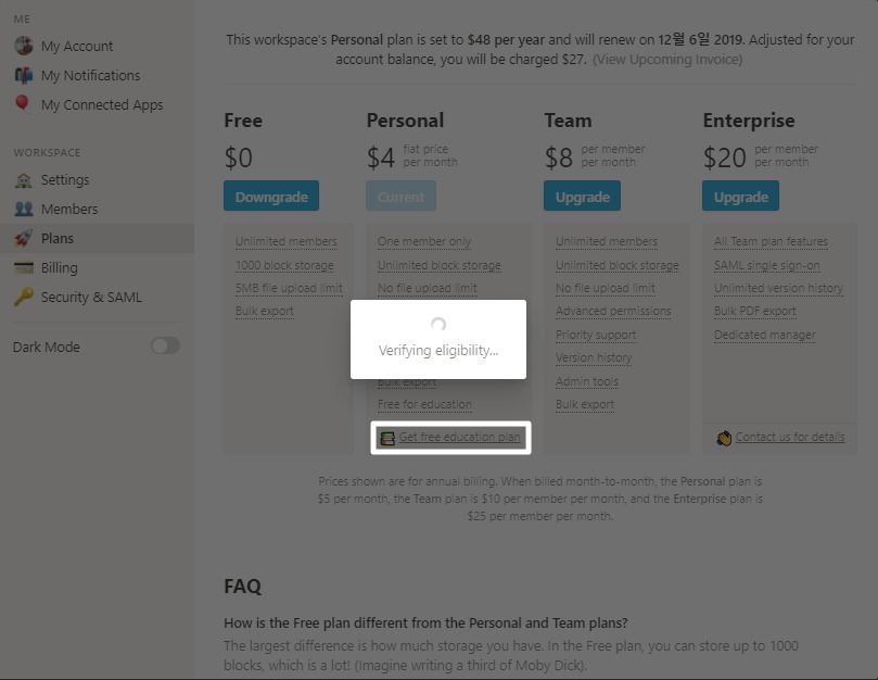 '.ac', '.edu'의 도메인 인증을 통해 교육업 종사자 인증을 받으면 Personal Plan을 무료로 이용할 수 있으며, 아래와 같이 이메일을 변경한 후 사용할 수 있습니다. 이미 결제한 계정의 경우, 남은 기간 만큼의 비용은 크레딧으로 환급됩니다.