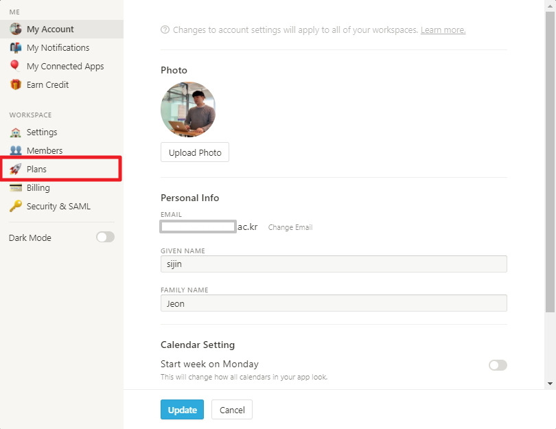 4. 교육기관용 도메인 이메일 계정으로 변경된 걸 확인한 후 Plans에 들어갑니다.