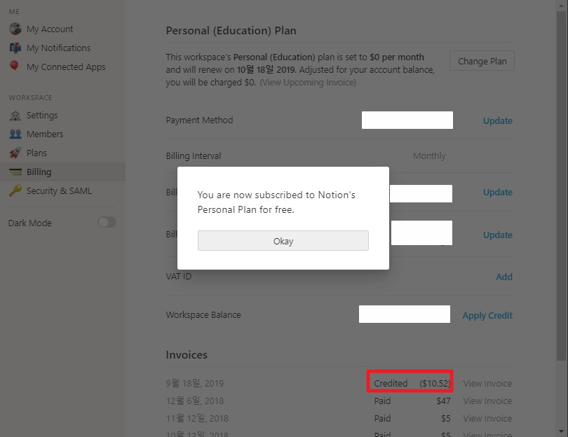 6. 인증이 완료되면 아래와 같은 창이 나타나고, Invoices 에서 환급된 크레딧도 확인할 수 있습니다.