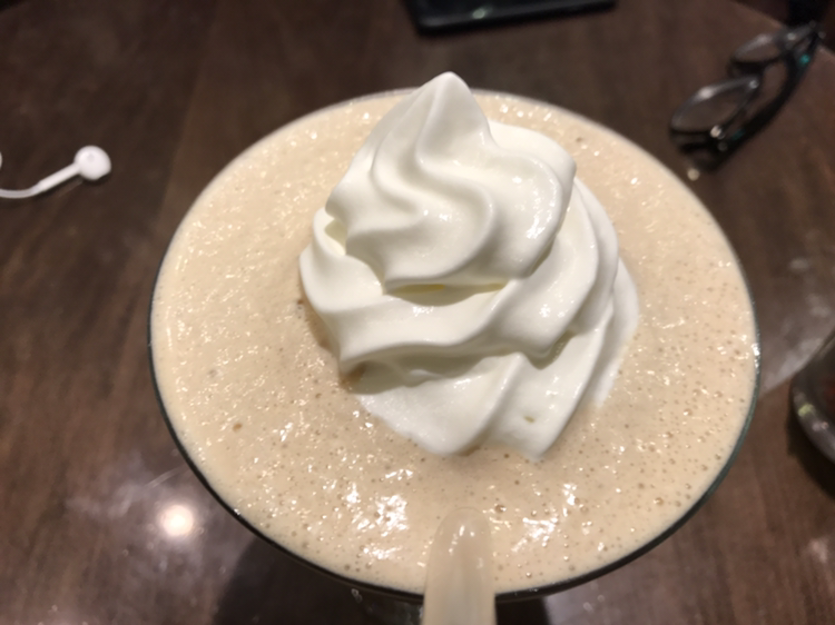 '고정관념이 이렇게 나쁜 것이구나'라고 깨닫게 해준 음료다. 맛도 커피와 휘핑크림, 초콜렛 시럽을 함께 먹는건데 조합이 좋지 않다. 프라페라고 해서 아이스크림과 커피가 같이 들어간 것을 생각했다. 위에는 생크림이고 밑에는 커피다 컵주변에 초코시럽이 둘러져 있다. 중요한 것은 4.75파운드. 7,000|원 가량인데 양이 굉장히 작다. 빨대로 한번 훅! 하면 몇모금안에 먹을 수 있는 양이다. 이 가격에 이걸 왜... 마시고 나면 입안에 텁텁함이 남는다. 초코시럽 때문인지 커피와 초코를 섞어 먹어 그런지 입안이 텁텁하여 물이나 아이스 아메리카노가 땡기는 맛이다.