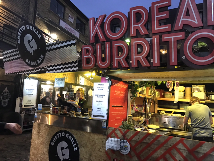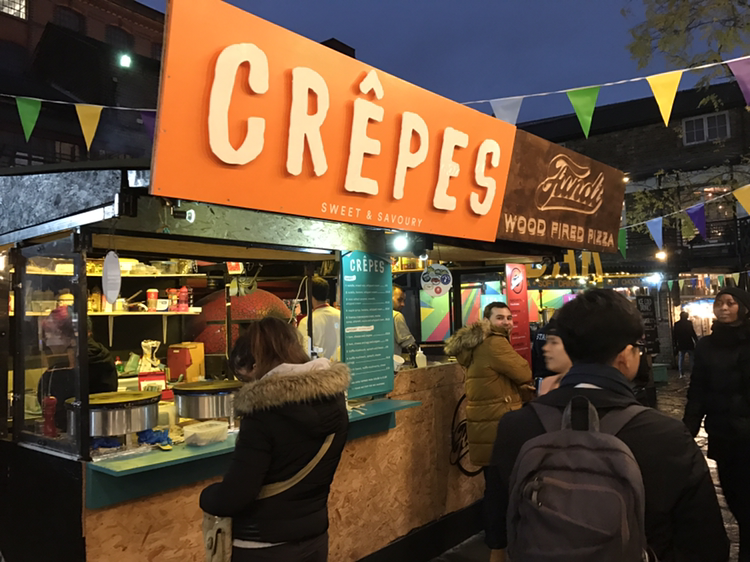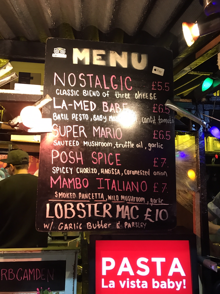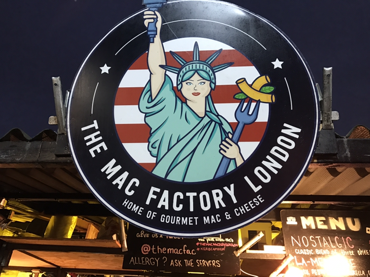 Camden lock Market의 푸드코트(?)다. 어젯밤 생각한 스트릿푸드가 여기 다 모여있었다. 신경도 쓰지 않던 스트릿푸드를 만나니 기분이 좋았다. 다양한 가게들을 보았다. 우리나라 야시장과 마찬가지로 세계음식들이 많았다. 인도, 맥시코 등이었다. Korean Buroto3도 있었다. 부리또에 불고기를 넣어주는 음식이었다. 그러나 우린 영국에 왔으므로 영국에 관련된 단어가 들어 있는 'The Mac Factory London'에 갔다. 이게 영국 음식인진 모르지만 런던이라는 단어가 들어 있으니 영국 음식이라고 생각하고 구매했다.