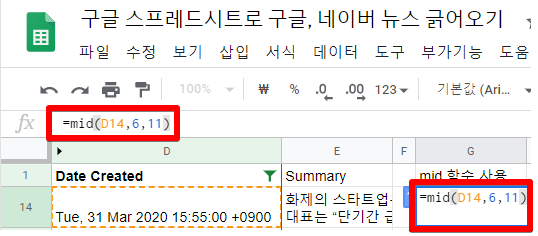 2. Date Created 열에서 '날짜'만 뽑아오기 위해 mid 함수를 사용해줍니다. mid 함수는 '문자열, 시작, 추출 길이'를 입력해야 합니다.