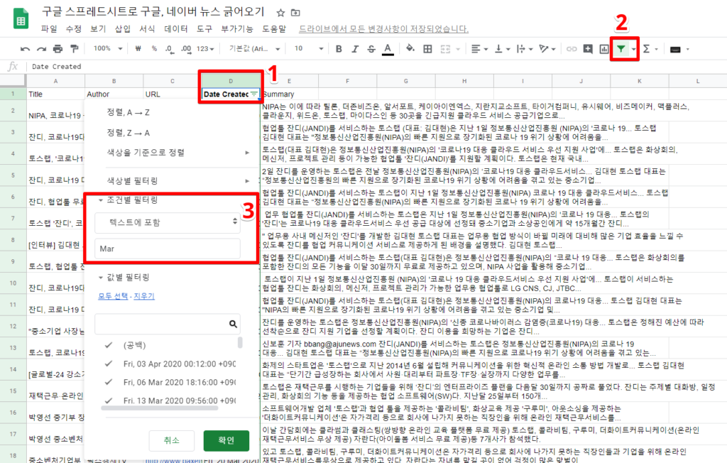 5. 아래 순서대로 필터링을 하면 2020년 3월 뉴스를 볼 수 있습니다.