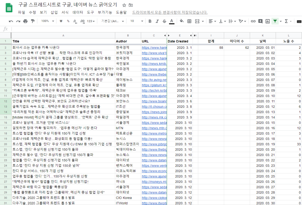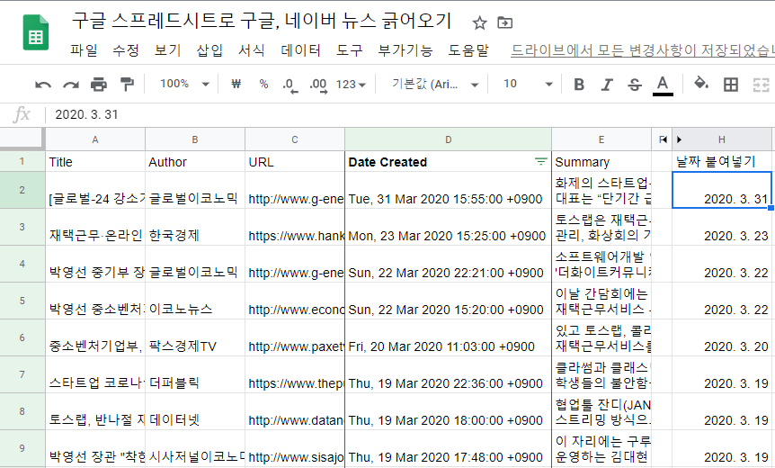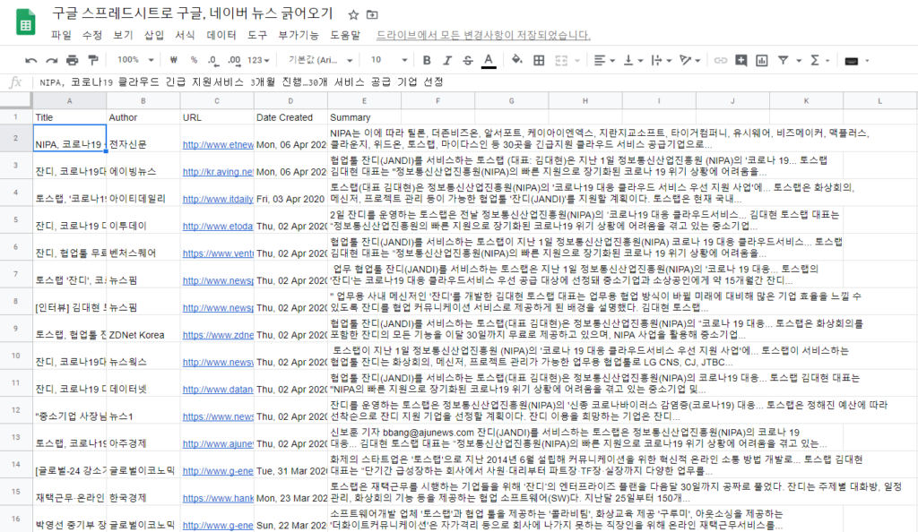4. Enter(엔터)를 누르면 Title, Author, URL 등 헤더가 생성되면서 '토스랩' 뉴스 100개를 가져올 수 있습니다.