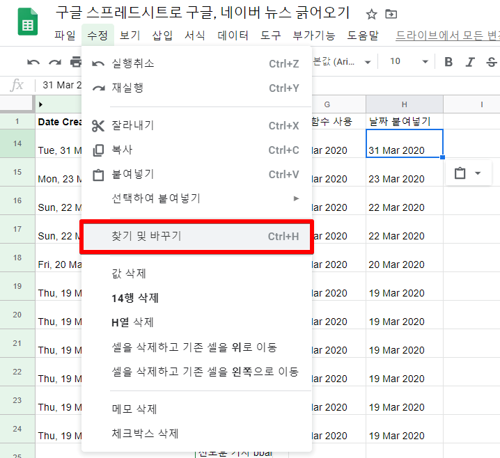 4. 일반 텍스트를 날짜 서식으로 바꿔줄 차례입니다. '수정 > 찾기 및 바꾸기(ctrl+H)'를 클릭해줍니다.