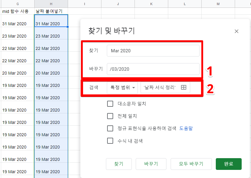 1) 주의하실 점은'Mar' 앞에 " "띄어쓰기가 있다는 것입니다. 띄어쓰기를 포함하여 찾기 및 바꾸기에 입력해주어야 합니다. 그렇지 않으면 '31 /03/2020'으로 변경되어 날짜 서식이 지정되지 않습니다.