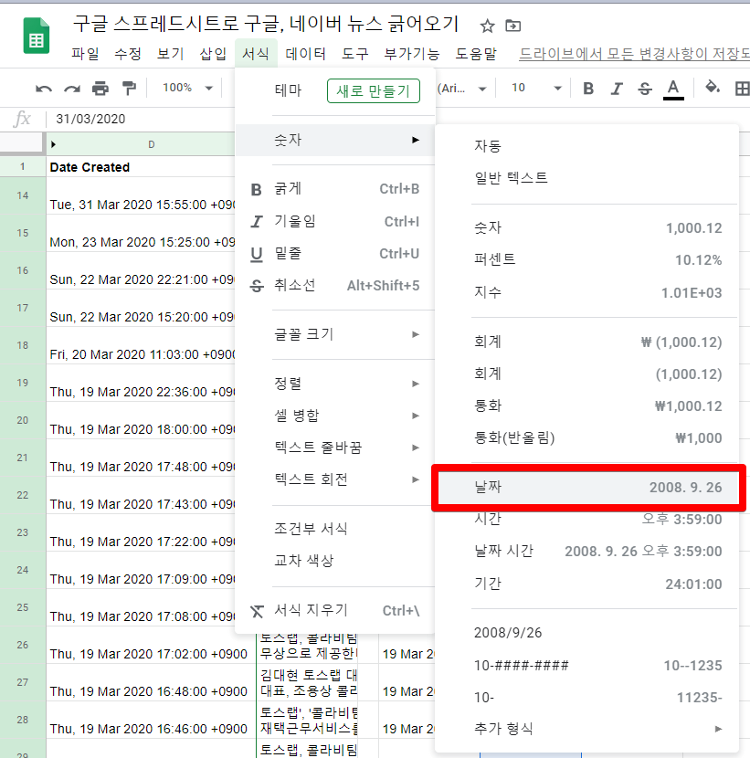 2020년 3월의 뉴스를 뽑기만 하면 필터링에서 끝나지만, 일자별로 어떤 뉴스가 나왔고, 몇 일에 가장 많은 뉴스가 나왔는지를 보려면 날짜 서식을 변경해 날짜별로 정렬해줘야 합니다. 날짜 서식을 조금 더 예쁘게 보고 싶다면 아래를 따라해주세요.