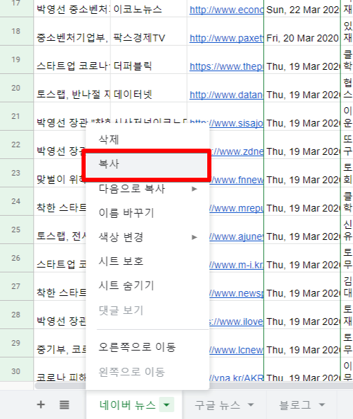이번 시간에는 웹 크롤링을 통해 구글, 네이버에 있는 기사를 긁어오는 방법을 알아보겠습니다. 비개발자인 제가 아주 쉽게 할 수 있었던 방법이니 여러분도 쉽게 할 수 있습니다. 걱정마시고 따라오세요. 제가 사용하는 시트는 맨 아래에 링크를 남겨둘테니 복사해 가셔서 링크만 바꿔 사용해보셔도 좋습니다.