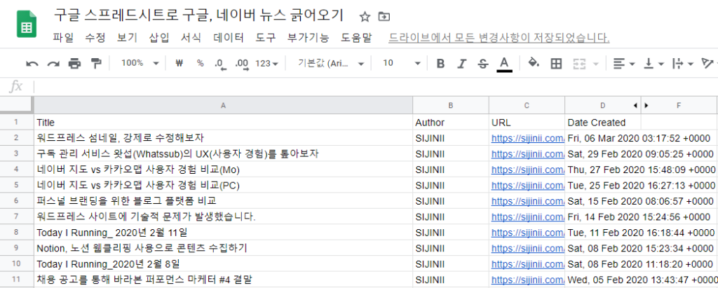 이제 어느정도 감을 익히셨나요? RSS 주소만 있으면 원하는 내용을 모두 스프레드 시트에 긁어올 수 있습니다. 가장 만만한 제 블로그를 긁어오도록 하죠. importfeed 함수 내 URL 입력칸에 "https://sijinii.com/feed/"를 입력하고 Enter를 누르면 아래와 같은 결과를 얻을 수 있습니다.