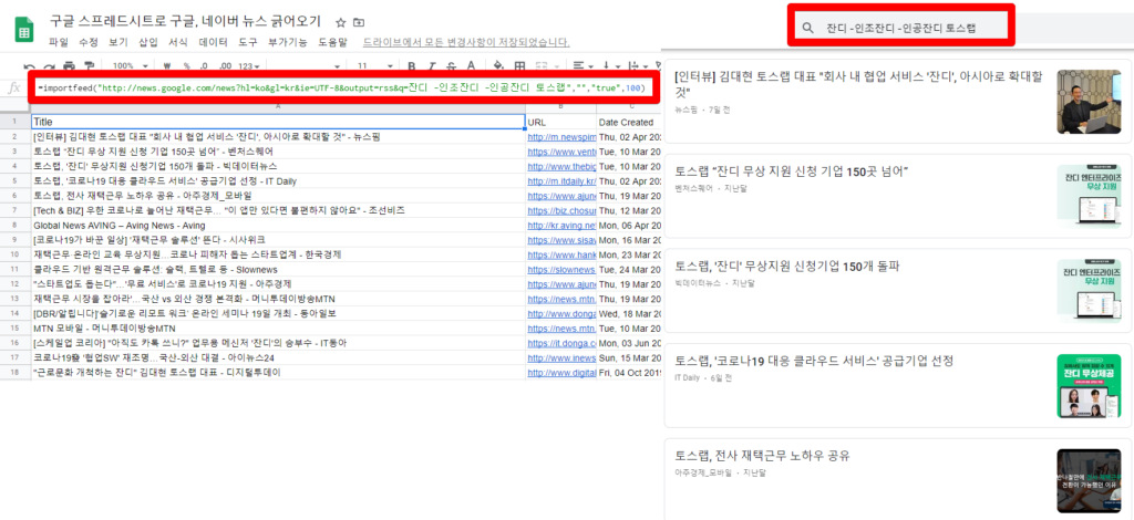 =importfeed("http://news.google.com/news?hl=ko&gl=kr&ie=UTF-8&output=rss&q=토스랩","",true,100)