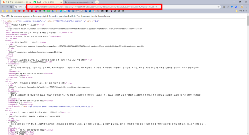 2. 뉴스검색 RSS보기를 클릭하면 아래 같은 사진이 나오고, RSS 주소를 읽어오는 창에서 주소창에 있는 주소를 복사합니다.