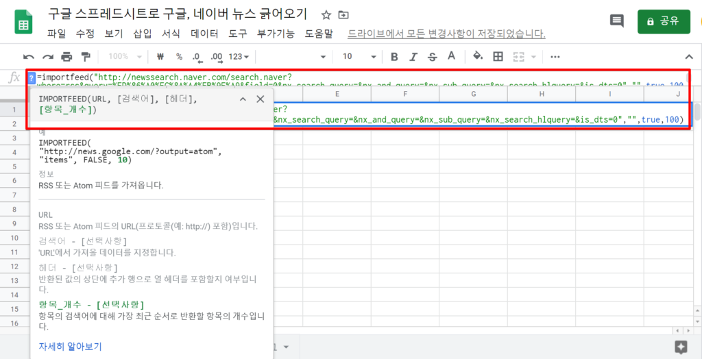 3. 구글 스프레드 시트를 열어 importfeed 함수 내 복사한 링크를 붙인 후, 검색어, 헤더, 개수를 입력해줍니다.