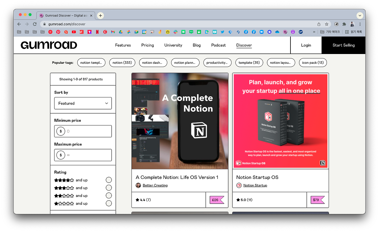 간편하게 다른 사람의 지식을 가져올 수 있는 방법은 다른 사람의 템플릿을 얻는 것입니다. 공짜로 얻을 수도 있고, 다른 사람의 작품을 구매할 수도 있습니다. 아직 국내에는 템플릿 시장이 활성화되어 있지 않기 때문에 역시 참고할 만한 템플릿은 많이 없습니다. 해외에는 노션 템플릿 시장이 많이 활성화되어 있으니 참고해보세요. 템플릿을 구매하지 않더라도 미리 보기 이미지를 통해 내용을 어느 정도 파악하고, 디자인을 참고할 수도 있습니다.