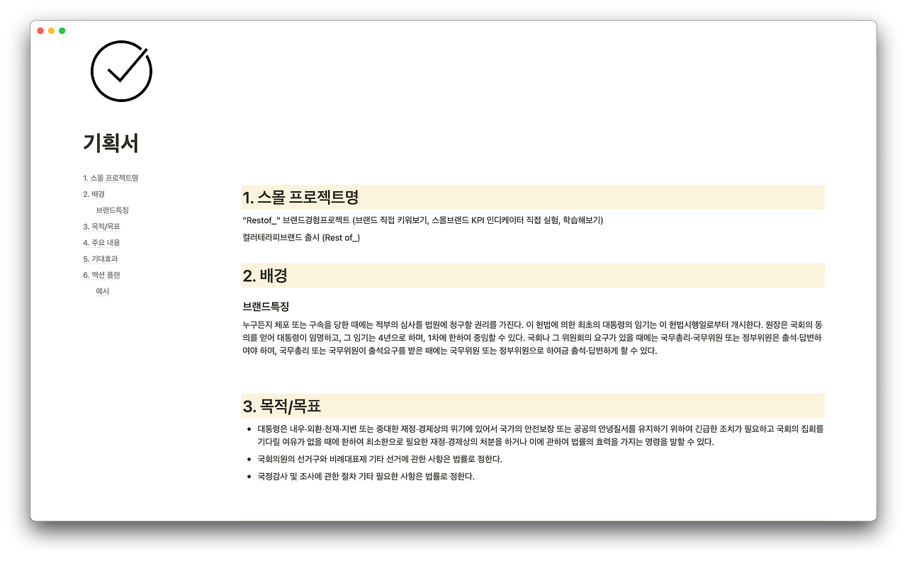 프로젝트 기획서는 엑셀과 파워포인트에 작성되어 있었습니다. 프로젝트를 시작하기 전 브리핑을 통해 전달받은 내용이라 노션의 페이지에 맞게 정리만 조금 해두었습니다.