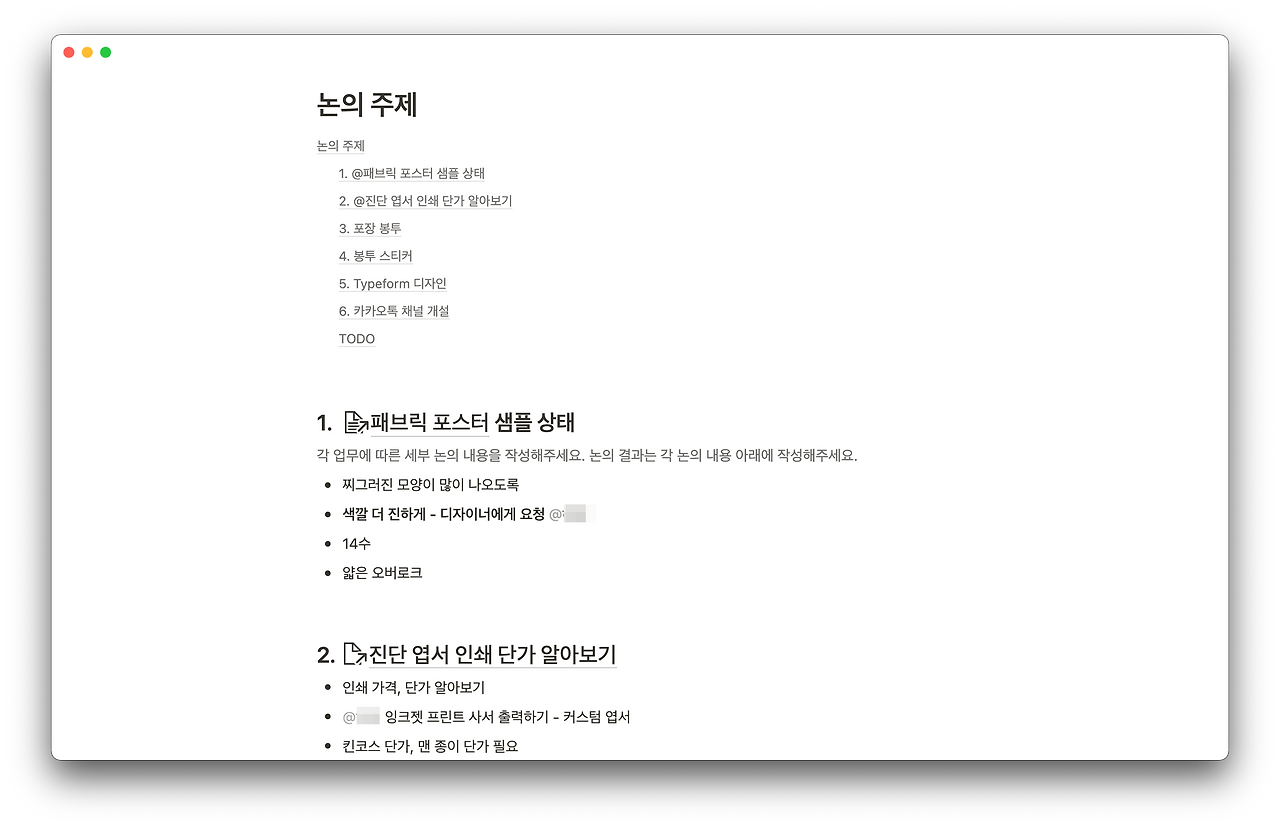논의 주제에 '/목차' 블록을 만들어 두면 주제를 일일이 작성하는 것보다 더 편리합니다.