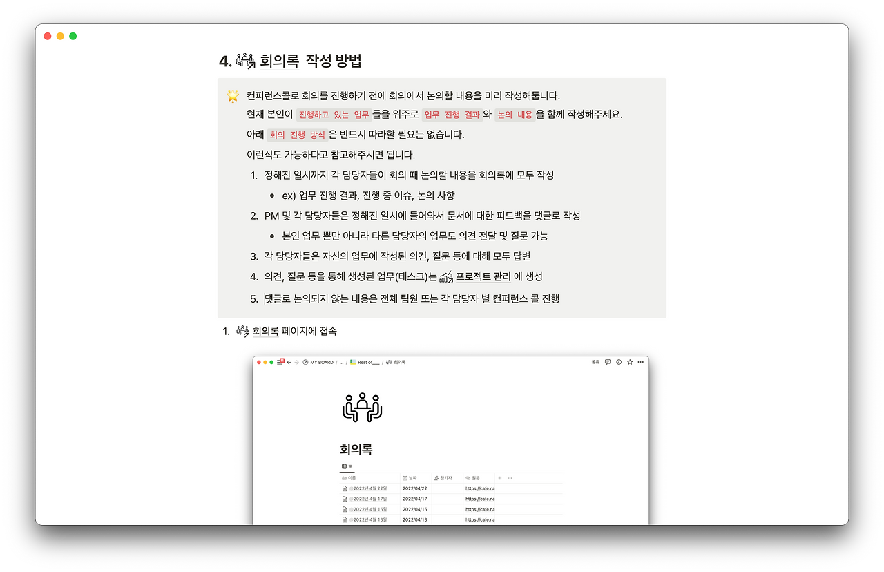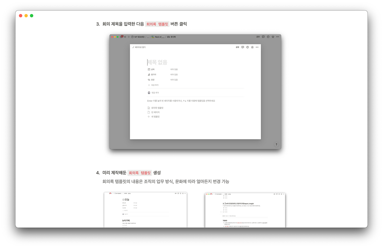 회의록 페이지는 템플릿을 만들어 '새로 만들기' 버튼을 누를 때마다 미리 지정한 서식이 똑같이 나타납니다.