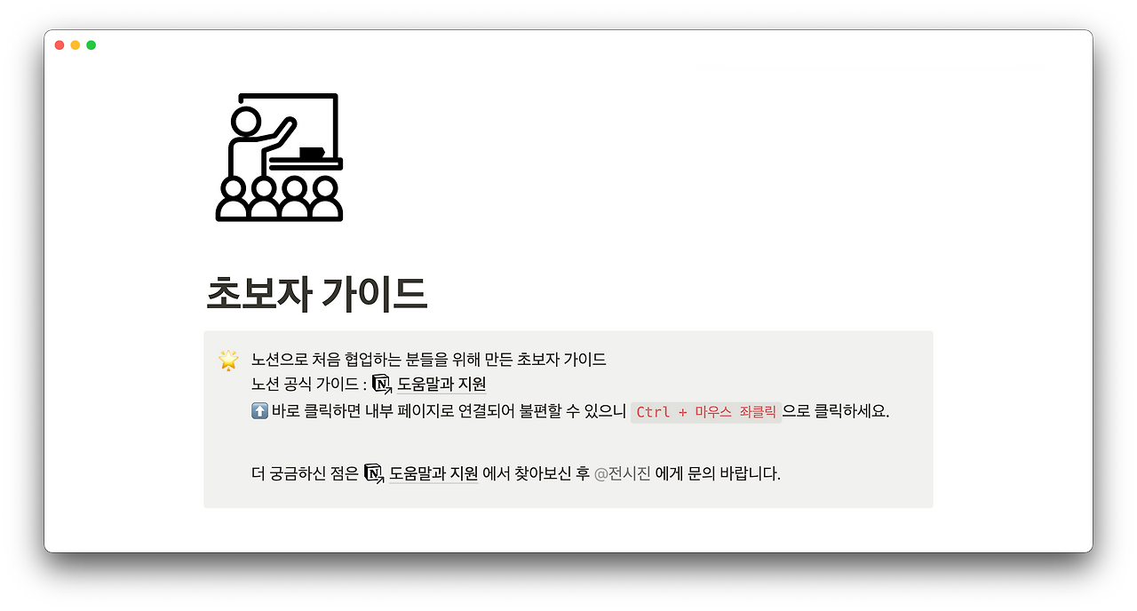 마지막 초보자 가이드는 이 페이지의 간단한 사용법 정도를 넣어두었습니다. 최대한 제가 페이지를 만드는 리소스를 줄이고자 노션의 공식 도움말과 지원 페이지를 활용했습니다.