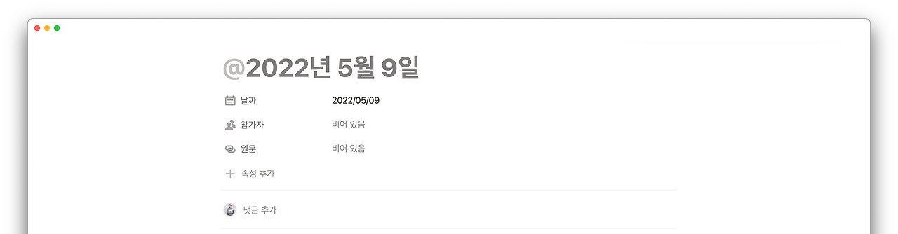 회의록 맨 위에는 오늘 회의의 논의 주제를 넣을 수 있게 해두었습니다. 주제를 작성하는 곳에는 해당 주제에 필요한 페이지를 멘션하고, 페이지 아래 필요한 논의 내용, 결정 사항, 할 일 등을 넣을 수 있도록 만들었습니다.