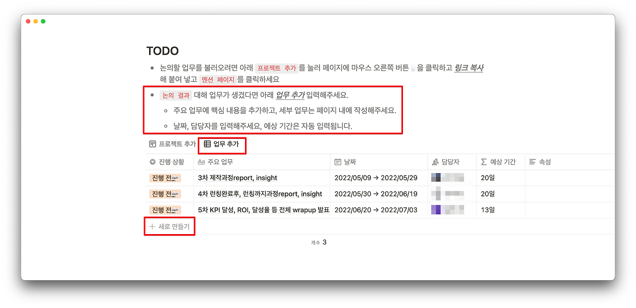 회의가 종료된 후 새로운 업무를 추가한다면 프로젝트 관리 DB에 바로 추가할 수 있게 만들었습니다. '업무 추가' 버튼을 클릭한 후 '새로 만들기' 버튼을 클릭하면 프로젝트 관리 DB에 진행 전 업무로 추가되어 회의 후 바로 할 일을 체크할 수 있습니다.