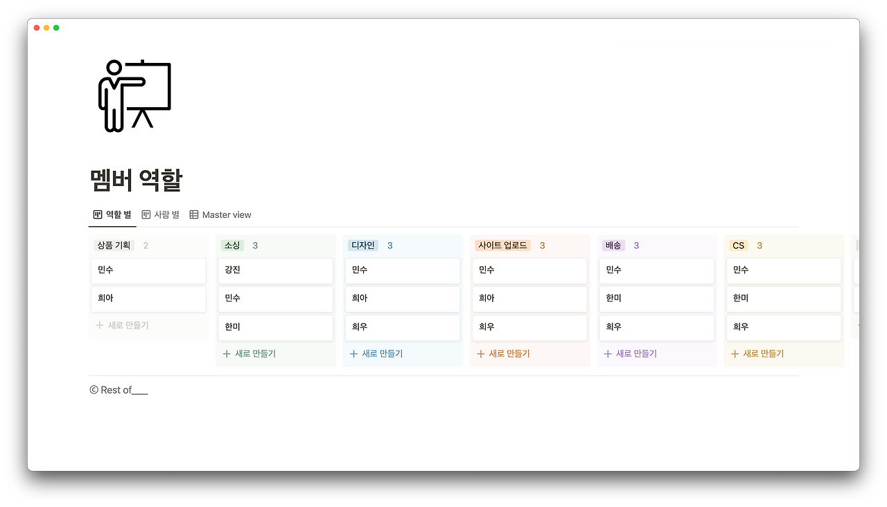멤버 역할 페이지는 노션을 이렇게도 사용할 수 있다는 걸 보여드리기 위해 만들었는데 팀은 많고, 멤버는 적다 보니 오히려 더 보기 불편해졌습니다. 이렇게 만들지 마세요.