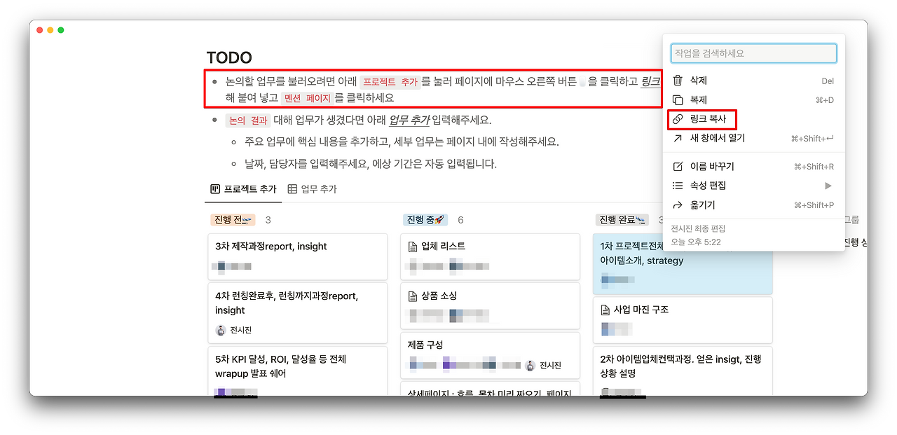 회의록의 마지막에는 회의록 작성에 필요한 페이지를 쉽게 불러오기 위해 프로젝트 관리 DB를 불러왔습니다. 프로젝트 추가 보기를 클릭한 다음 페이지의 링크를 복사하고 붙여 넣으면 멘션 페이지를 통해 쉽게 페이지를 불러올 수 있습니다.