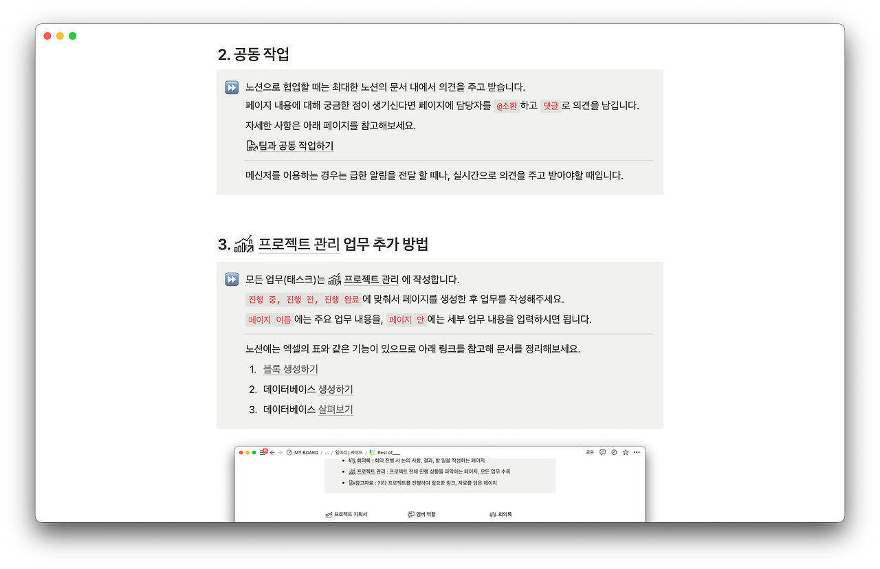 - 특정 사람의 업무에 의견을 전달할 때는 노션 페이지에서 멘션 한다.