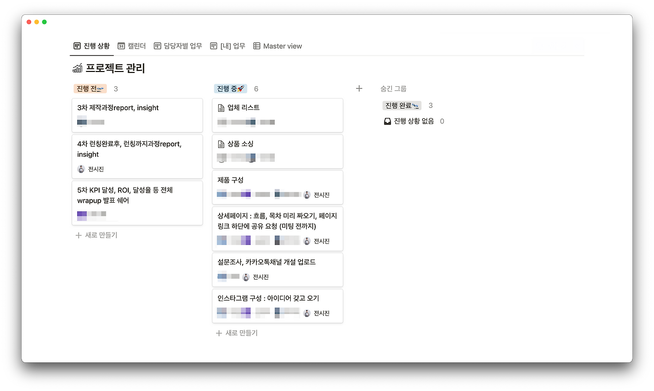 프로젝트 관리 페이지는 가장 많이 작성해야 하면서도 가장 어려워했던 페이지라 최대한 간편하게 만들었습니다. 진행 전, 진행 중, 진행 완료로 나눠져 있고, 카드를 옮기기만 하면 되는 것이죠. 세부 내용은 페이지 안에 작성해달라고 요청했습니다.