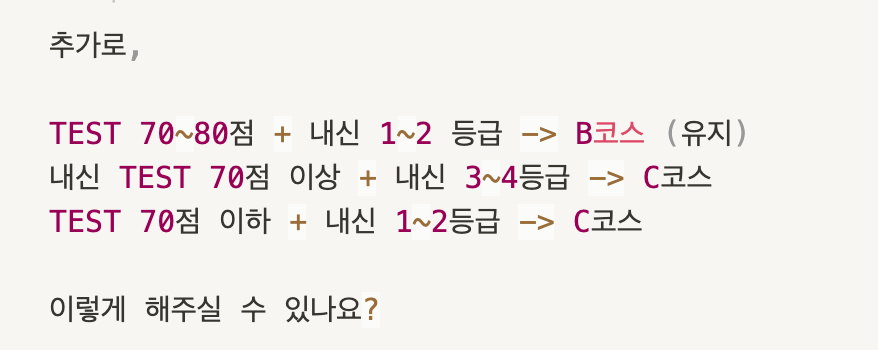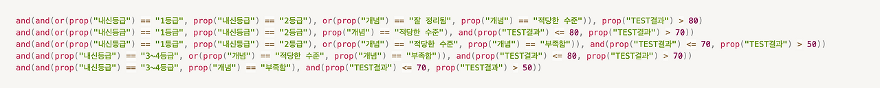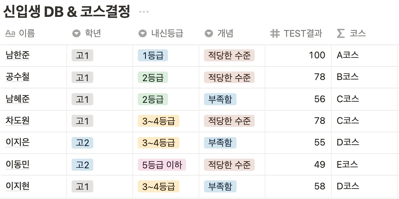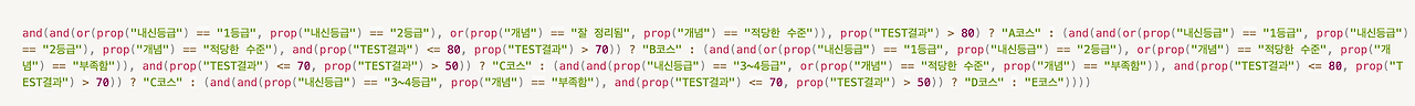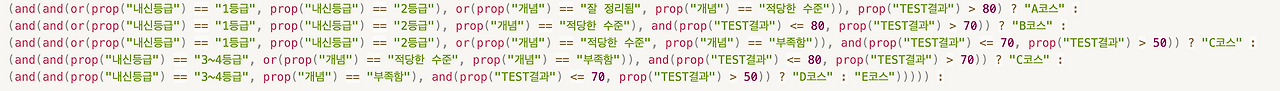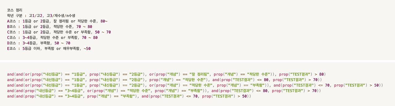 and(and(or(prop("내신등급") == "1등급", prop("내신등급") == "2등급"), or(prop("개념") == "잘 정리됨", prop("개념") == "적당한 수준")), prop("TEST결과") > 80) ? "A코스" : (and(and(or(prop("내신등급") == "1등급", prop("내신등급") == "2등급"), prop("개념") == "적당한 수준"), and(prop("TEST결과") <= 80, prop("TEST결과") > 70)) ? "B코스" : (and(and(or(prop("내신등급") == "1등급", prop("내신등급") == "2등급"), or(prop("개념") == "적당한 수준", prop("개념") == "부족함")), and(prop("TEST결과") <= 70, prop("TEST결과") > 50)) ? "C코스" : (and(and(prop("내신등급") == "3~4등급", or(prop("개념") == "적당한 수준", prop("개념") == "부족함")), and(prop("TEST결과") <= 80, prop("TEST결과") > 70)) ? "C코스" : (and(and(prop("내신등급") == "3~4등급", prop("개념") == "부족함"), and(prop("TEST결과") <= 70, prop("TEST결과") > 50)) ? "D코스" : "E코스"))))