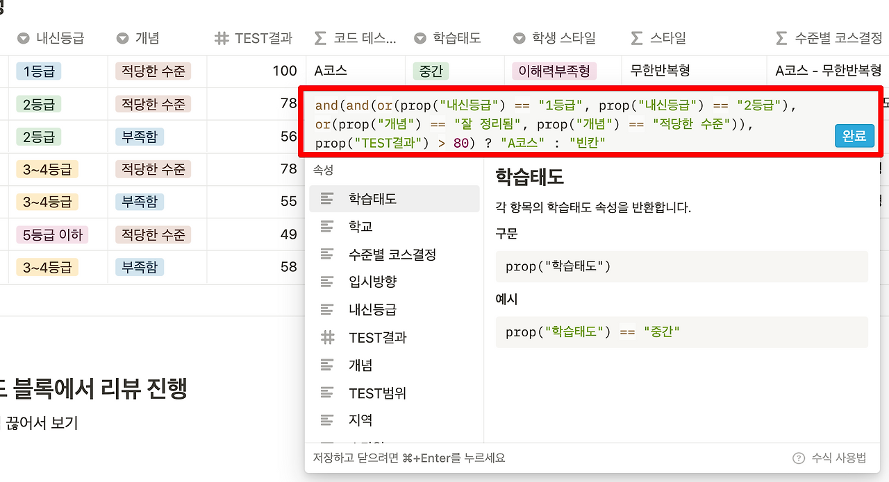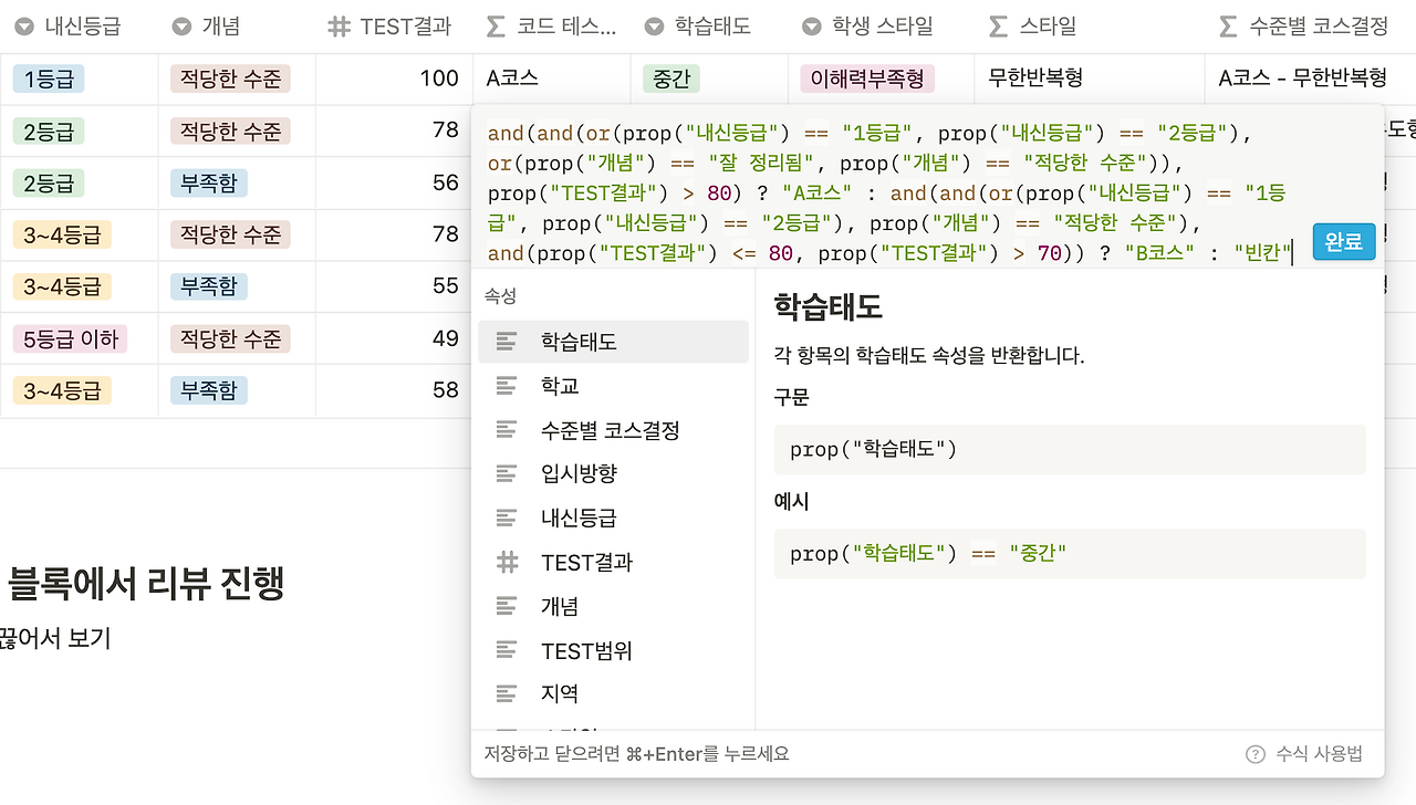 and(and(or(prop("내신등급") == "1등급", prop("내신등급") == "2등급"), or(prop("개념") == "잘 정리됨", prop("개념") == "적당한 수준")), prop("TEST결과") > 80) ? "A코스" : "빈칸"