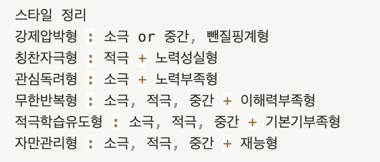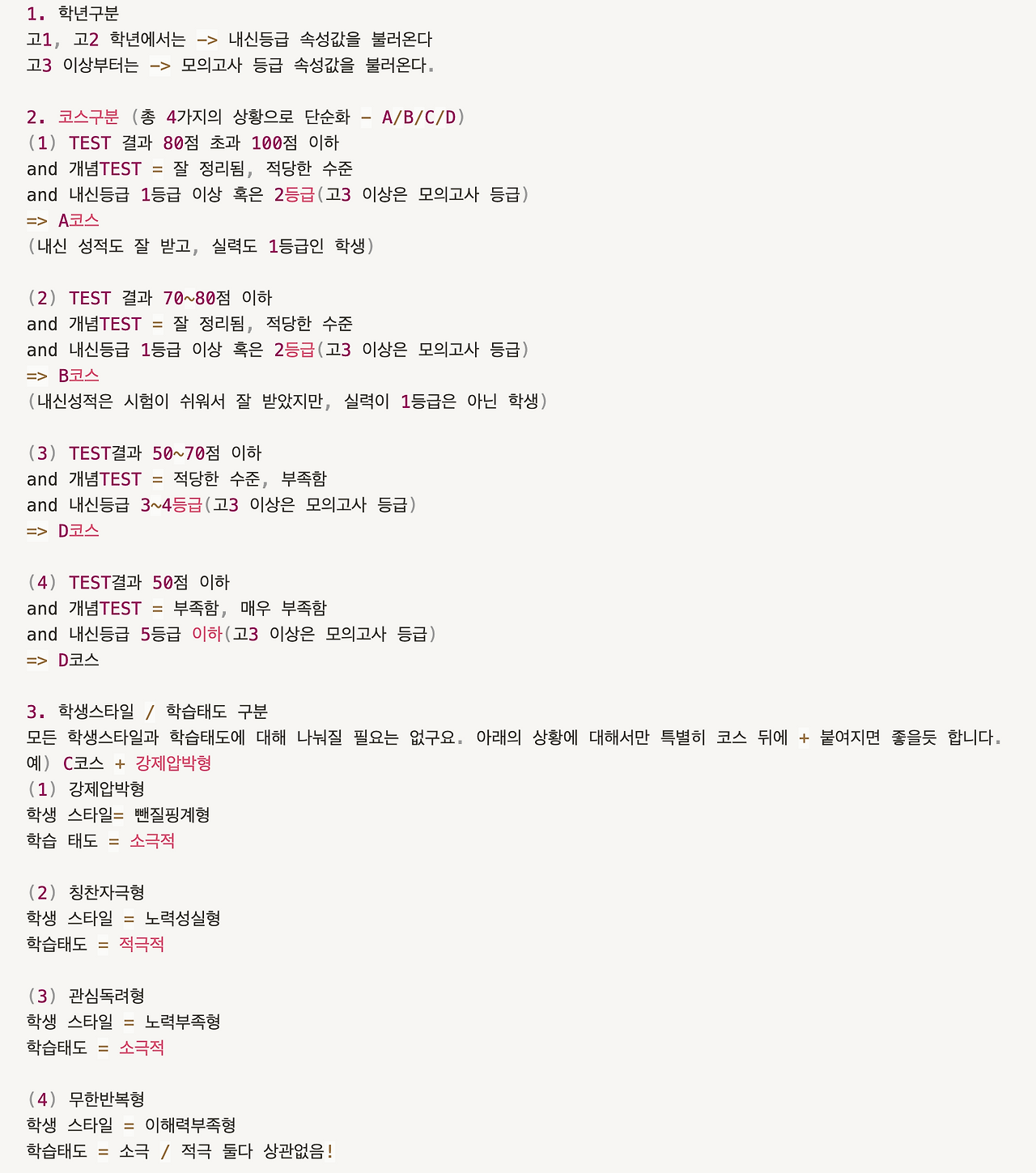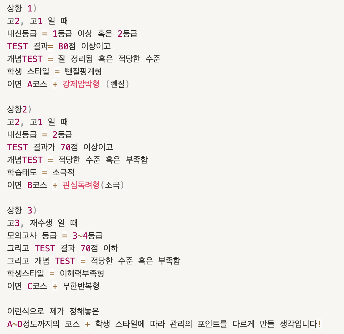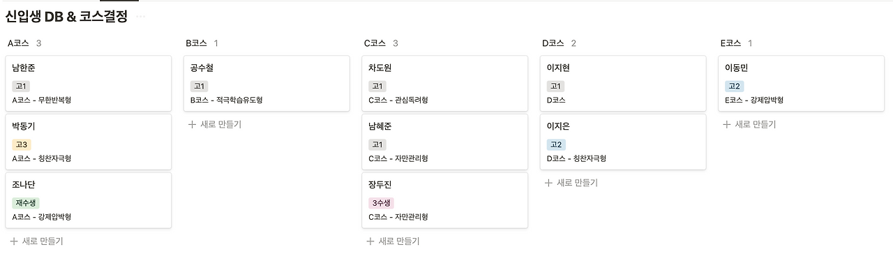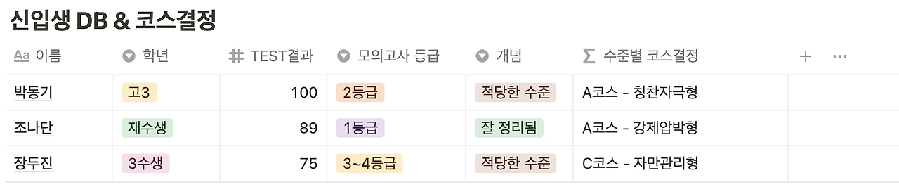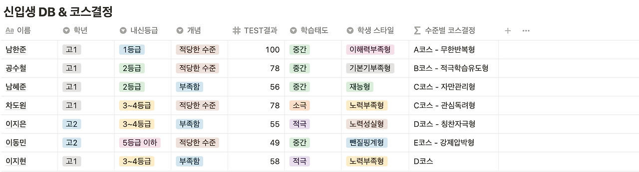 최대한 단순하게 만들기 위해 일단 코스와 스타일을 분리했습니다. 성적에 따른 코스를 구분하고, 학생들의 태도에 따른 스타일을 따로 작성하여, 나중에 새로운 수식 열에서 합쳐주는 방식을 선택했습니다.