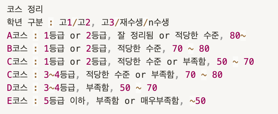 코스에서도 학년을 분리했습니다. 고1, 고2 학생들은 내신등급만 보고, 고3, 재수생, n수생 학생들은 모의고사 등급만 보기 때문에 나중에 함수를 분리해서 작성해줄 수 있을 것 같았죠.