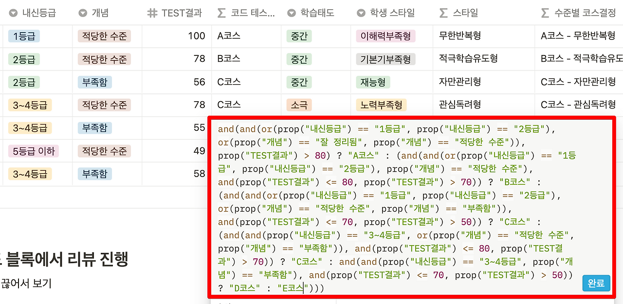 and(and(or(prop("내신등급") == "1등급", prop("내신등급") == "2등급"), or(prop("개념") == "잘 정리됨", prop("개념") == "적당한 수준")), prop("TEST결과") > 80) ? "A코스" : and(and(or(prop("내신등급") == "1등급", prop("내신등급") == "2등급"), prop("개념") == "적당한 수준"), and(prop("TEST결과") <= 80, prop("TEST결과") > 70)) ? "B코스" : "빈칸"