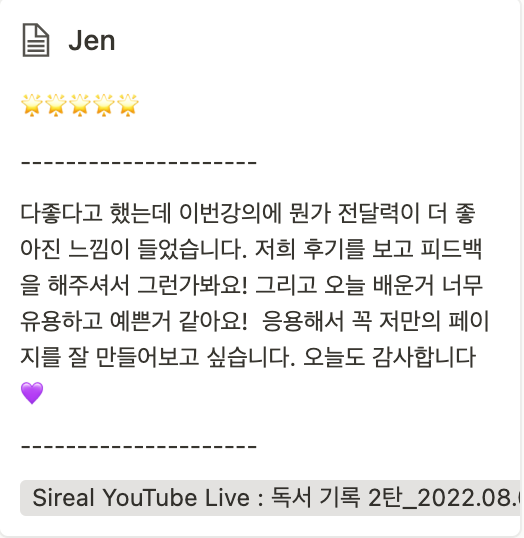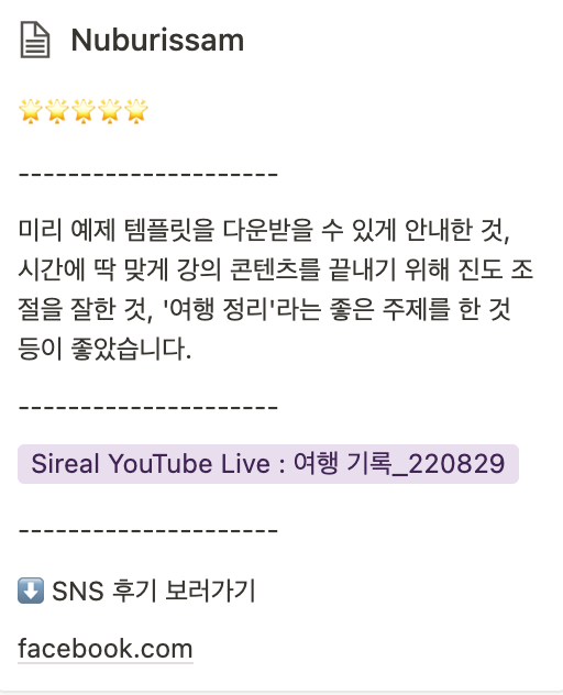 시리얼 라이브를 진행하며 중요하게 여겼던 부분 중 하나가 강의 후기다. 5년째 강의를 진행 중이지만 발전하지 않는 사람이 되기는 싫어서 가능하면 매번 강의 후기를 받고 있다. 시리얼 라이브도 나에겐 강의의 일종이기 때문에 이번 기회를 통해 한 단계 더 도약을 해보고자 강의 후기를 받았다. 강의 후기를 많이 받기 위해 SNS에 올린 사람들에겐 유료 템플릿을 무료로 전달해주는 이벤트도 진행했다.