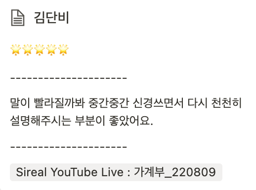 - 채팅에 너무 신경 써서 강의 진도가 못 나가거나 잡담이 너무 많아진다는 피드백이 있어서 이미 똑같이 지나온 내용이라면 타임머신 기능으로 뒤로 돌아가서 보고 오시라고 답변하니 강의 진도에도 문제가 없었다.
