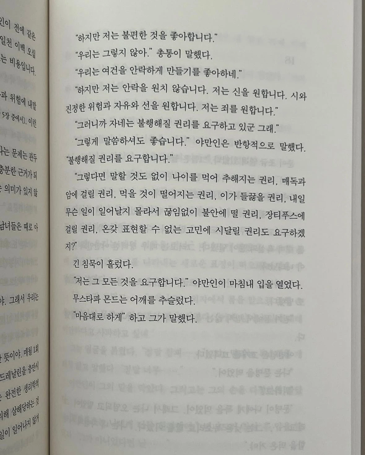 우린 마치 현실을 흐린 눈으로 바라보기에 애쓰며 삶이 희극이라 느끼며 사는 바보들일지도 몰라요. 귀를 막고 책장만 넘겨도 이토록 비극인데. 자유의지에 반목하여야만 만날 수 있는 유토피아라면 굶주리고 추위에 떨더라도 디스토피아의 길고양이로 살겠습니다.