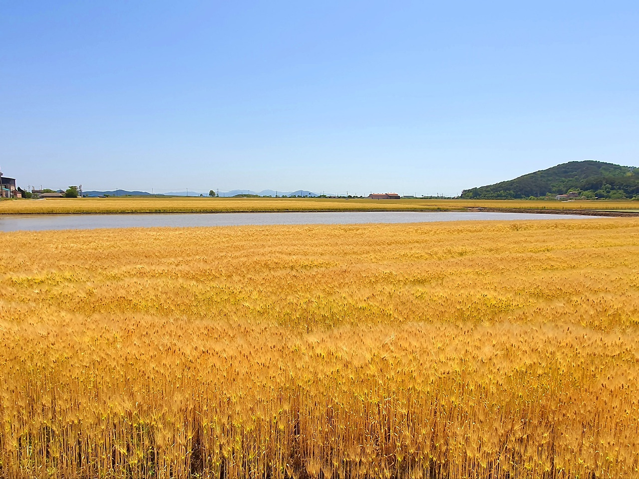 ‘흔들리지 않고 피는 꽃이 어디 있으랴‘를 차용하여 ’지지 않고 다시 태어나는 꽃이 어디 있으랴‘라고 말씀드리고 싶군요. 바로 일 년 전만 해도 사월의 꽃봄 보다는 오월의 늦봄이 좋더니만, 어찌 올해는 자꾸만 지나버린 사월을 그리워하네요. 나이가 들수록 하루 한순간의 뒷모습을 돌아보는 시간이 길어진다 하더니만, 저도 딱 그런가 봅니다. 나무들마다 초록이 무성해져서 건강한 청소년들처럼 우람해지기 시작했는데요, 동시에 그 아래에서 지고 있는 꽃잎들에게 눈길이 더 갑니다. 그래서 화려한 개화의 모습이 아니라, 누렇게 져버린, 구부러진 꽃잎 몇 송이를 모아서 사진으로 위로했습니다. ’나 라도 너를 기억하겠노라’하고 속삭이면서요. 반면에 가을 풍경처럼 노랗게 익어서 아름다운 작물도 있지요. 푸른 청보리는 온데 간데 없고, 익을대로 익은 황금보리를 어제도 들판에서 머무는 바람과 함께 사진에 담았습니다. 저 멀리 보이는 보리 지평선만 보아도 그냥 맘이 달래지더군요. 사실 어제 조금 화나는 일이 있었는데, 오는 길에 이 보리밭을 만나지 않았더라면 남은 하루의 시간이 얼마나 허탈했을까 싶었지요. 다행히도 금새 마음이 풀어져서 저녁에는 지인들과 재밌게 놀았답니다. 휴일 후, 스트레스가 쌓일 수 있는 월요일이죠. 혹시 오늘 화나는 일이 생긴다면 심호흡 한번 길게 하고 가까이 있는 초록 산길이나 누런 보리밭으로 달려가세요. 당신 마음에 시원한 폭포수 길이 생겨나서 행복비타민이 가득 담긴 폭포 웅덩이가 금방 보일거예요. 오늘은 류근시인의 <두물머리 보리밭 끝>입니다.