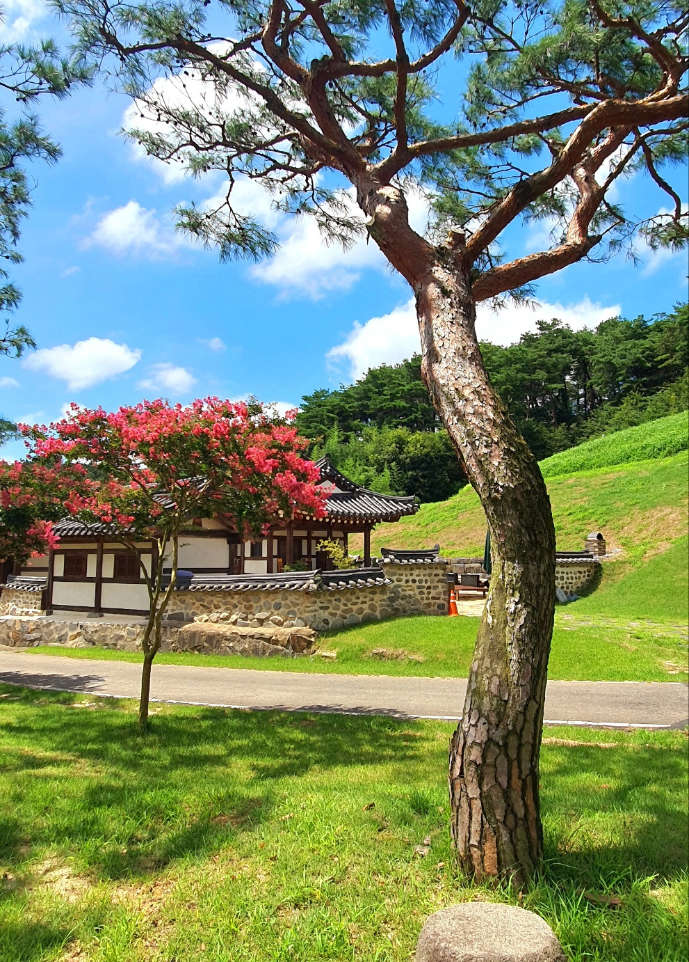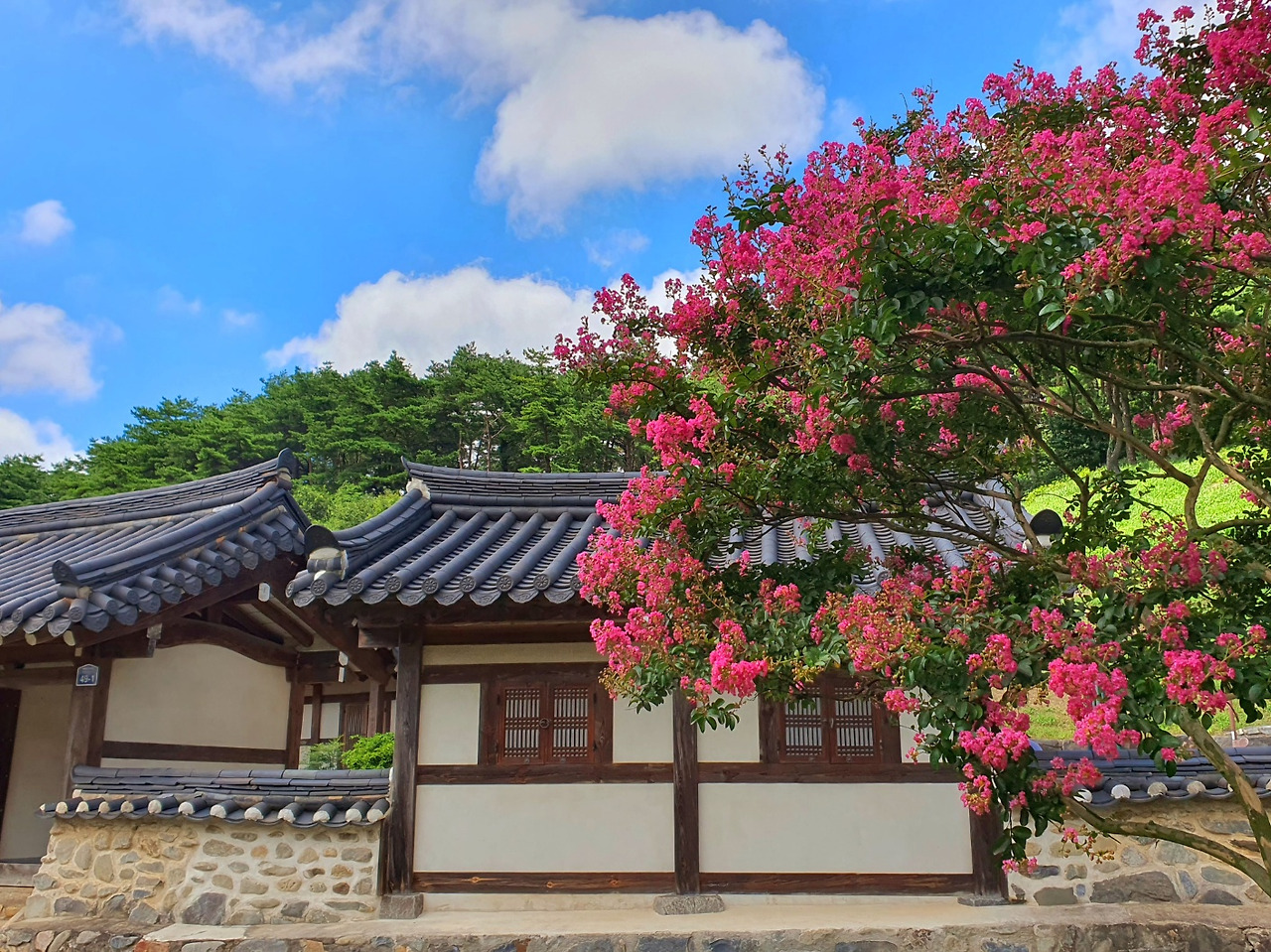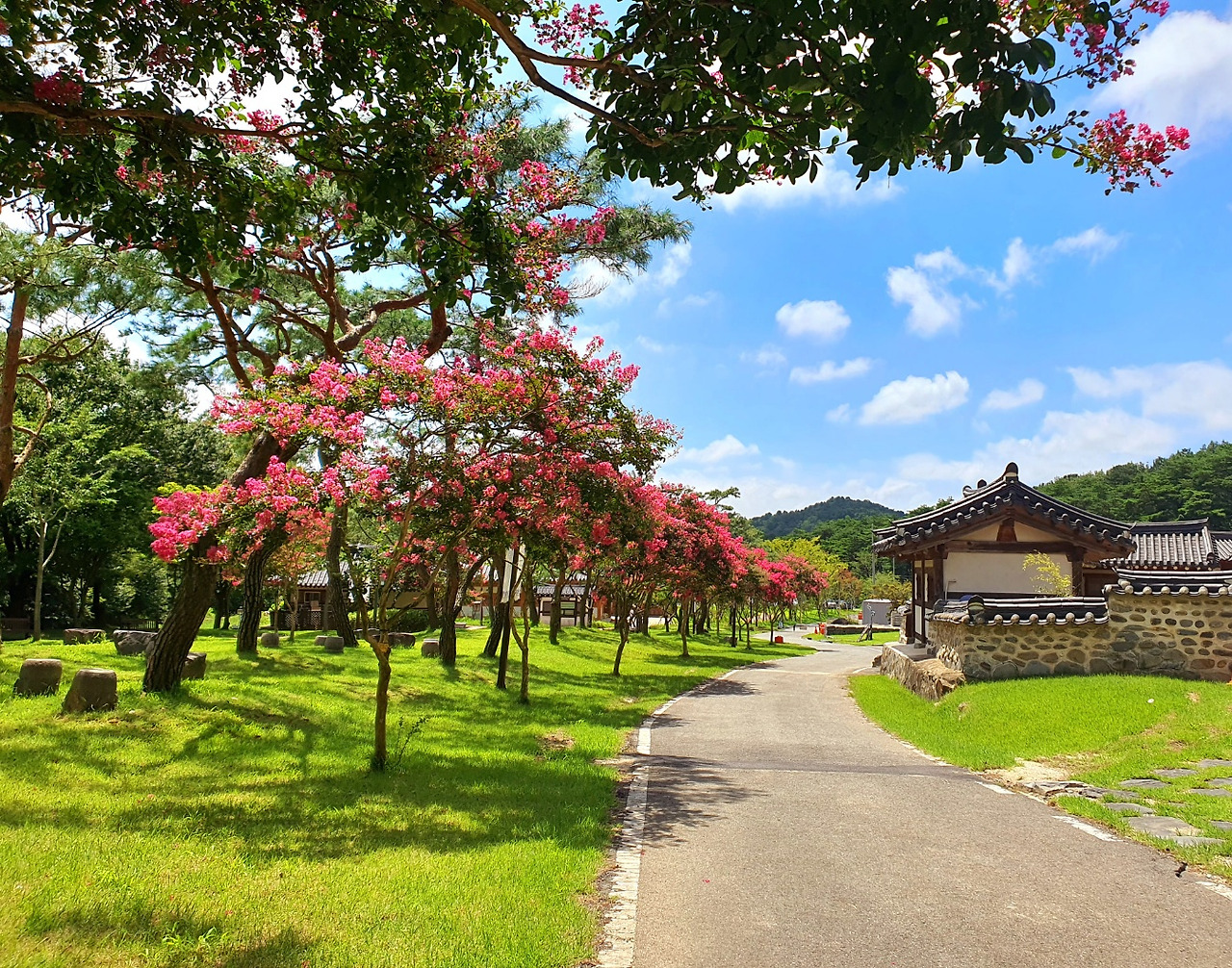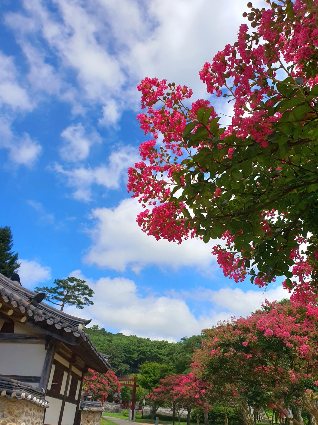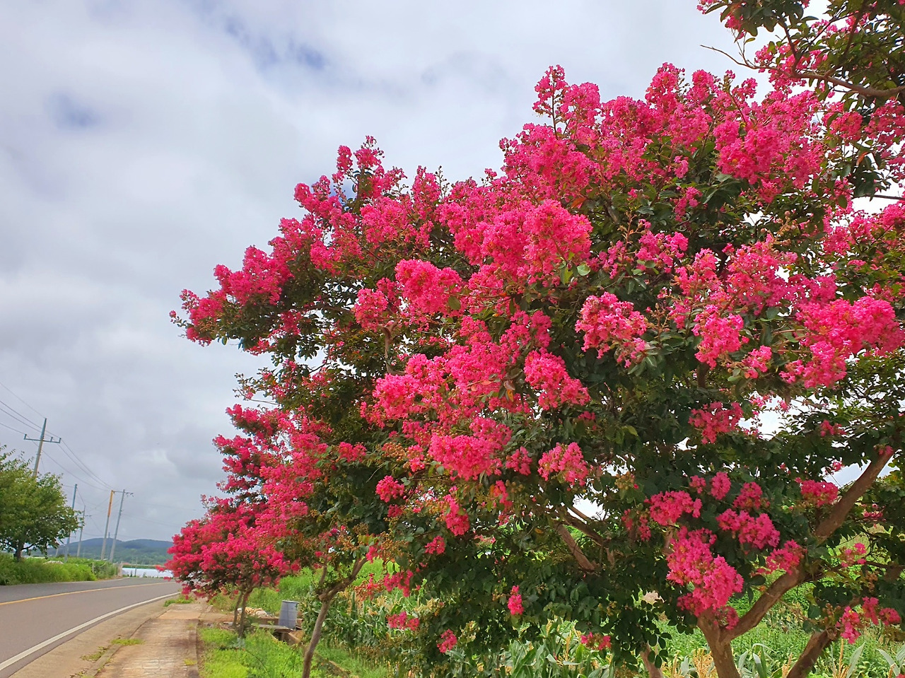 말랭이 어귀에 들어서는 데 또 수호나무처럼 배롱나무가 활짝 피어난 꽃잎을 달고 맞이하더군요. 어느 해부터인가 여름이면 가로수로 배롱나무꽃이 보이더니 이제는 제 자리를 잡은듯해요. 책방에서 가까운 서천에는 배롱나무꽃 가로수길(서천군 종천면-서면, 10km)과 문헌서원(고려 학자 목은 이색가문 제향, 서천군 기산면)이 있어서 친구와 ‘후딱여행’길을 떠났지요.