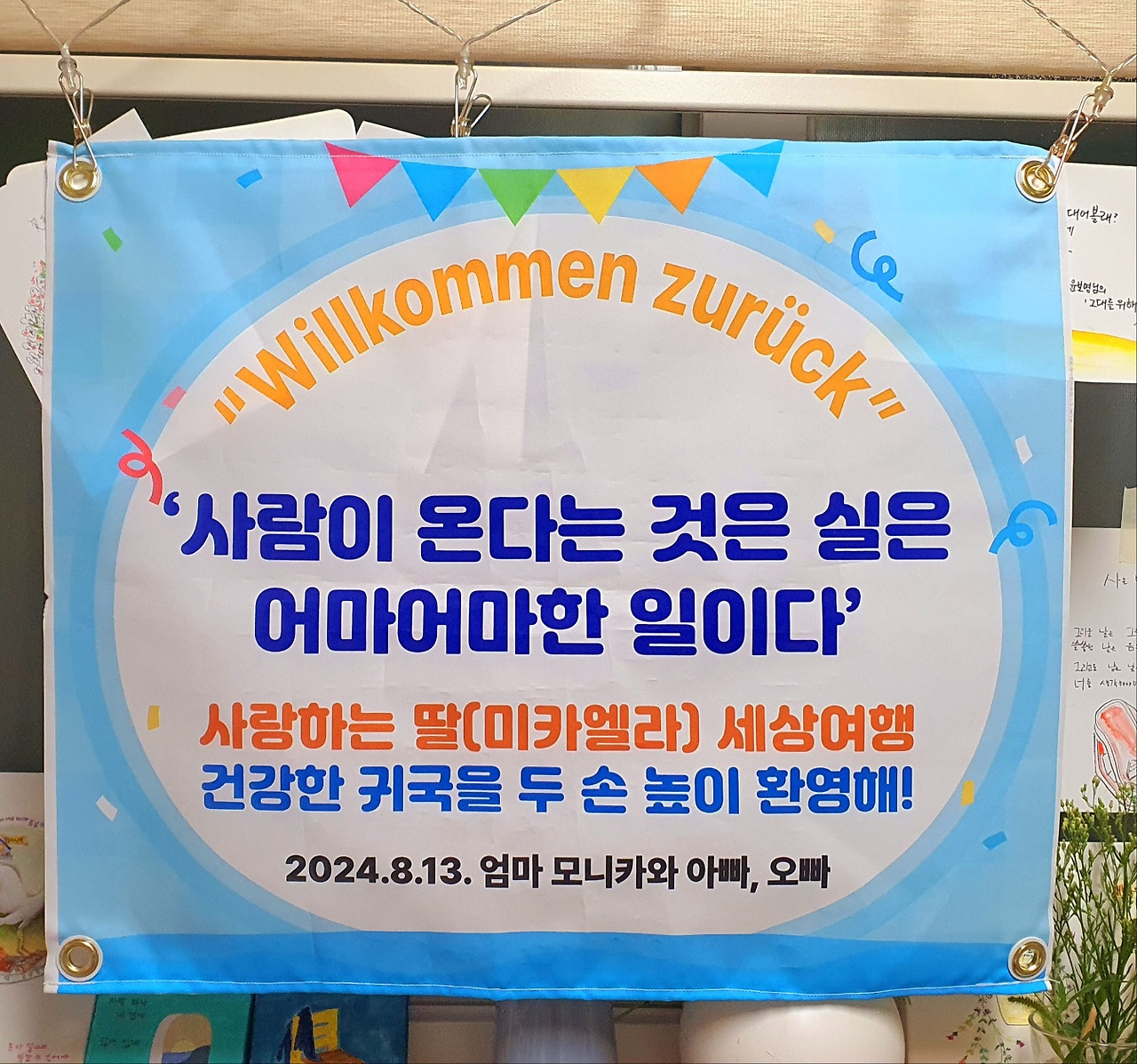 공항에 가기전 딸의 환영문구 한 장을 준비했었습니다. 단연코 정현종 시인의 <방문객> 첫 구절이 생각나더군요. 광고하는 후배에게 톡을 넣어 문구를 주었더니 잘 만들어 놓았어요. 사실 처음엔 뭐 이런 것을?? 하는 맘이 있었지만, 이것 역시도 '두 번 할 수 없을지도 몰라' 하는 맘이 스쳐가길래, 맘을 바꿔 만들어봤지요. 제 딸이 언제든지 저를 생각할때 ‘특별한 엄마였어’라는 추억을 갖도록, 시인의 시 구절을 인용했답니다. 참 잘 한 것 같아요.